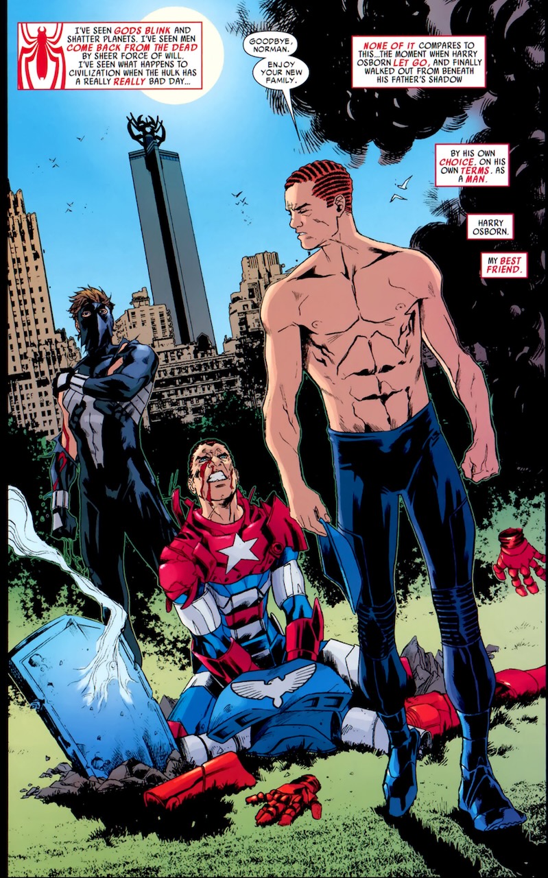 Norman gets the crap knocked out of him and Spider-Man has the chance to do what Wolverine suggested at the beginning of the arc: Kill Norman. Instead, though, he talks Harry out of killing his father and Harry leaves Norman shattered to enjoy his new family of Lily Hollister and their son.