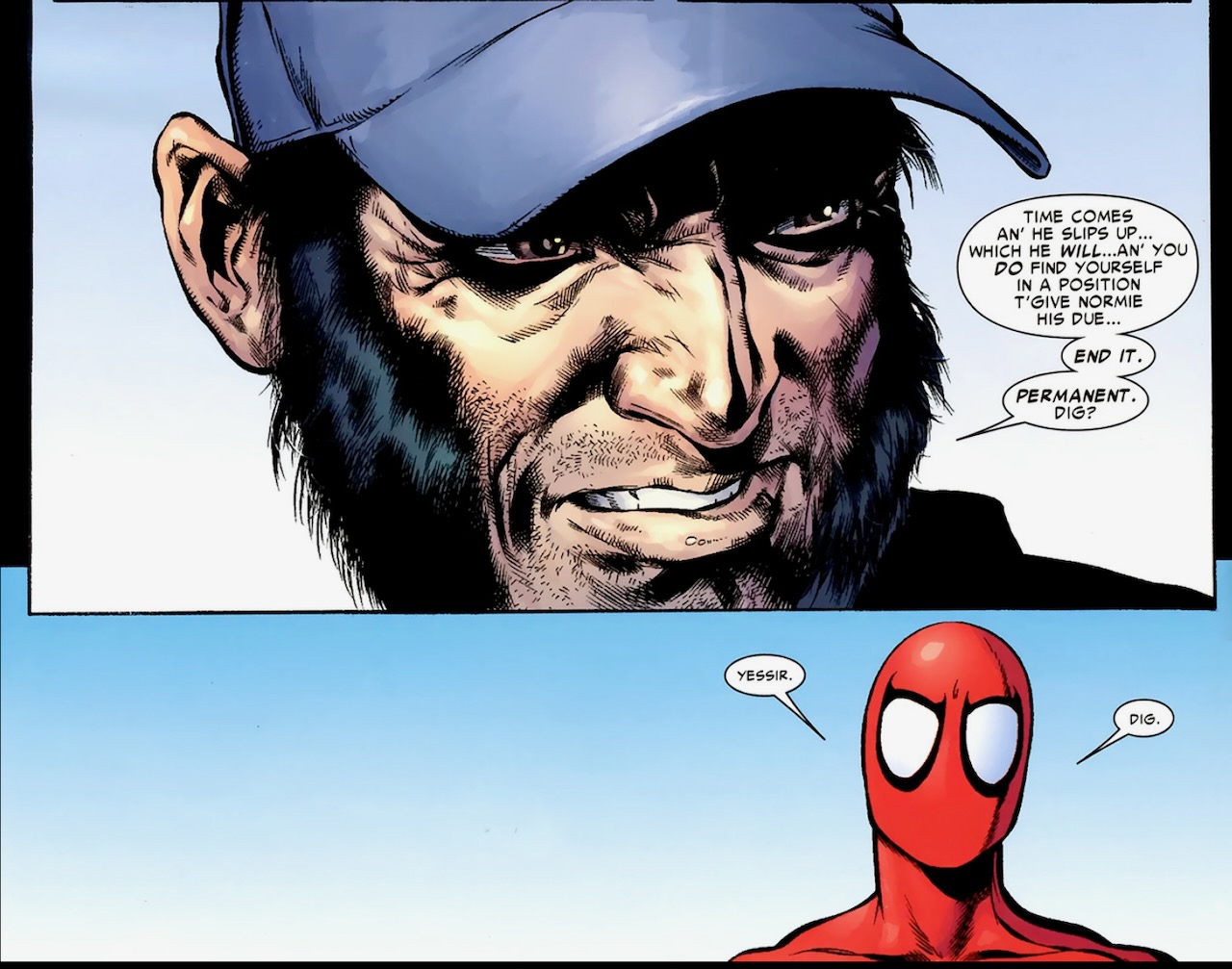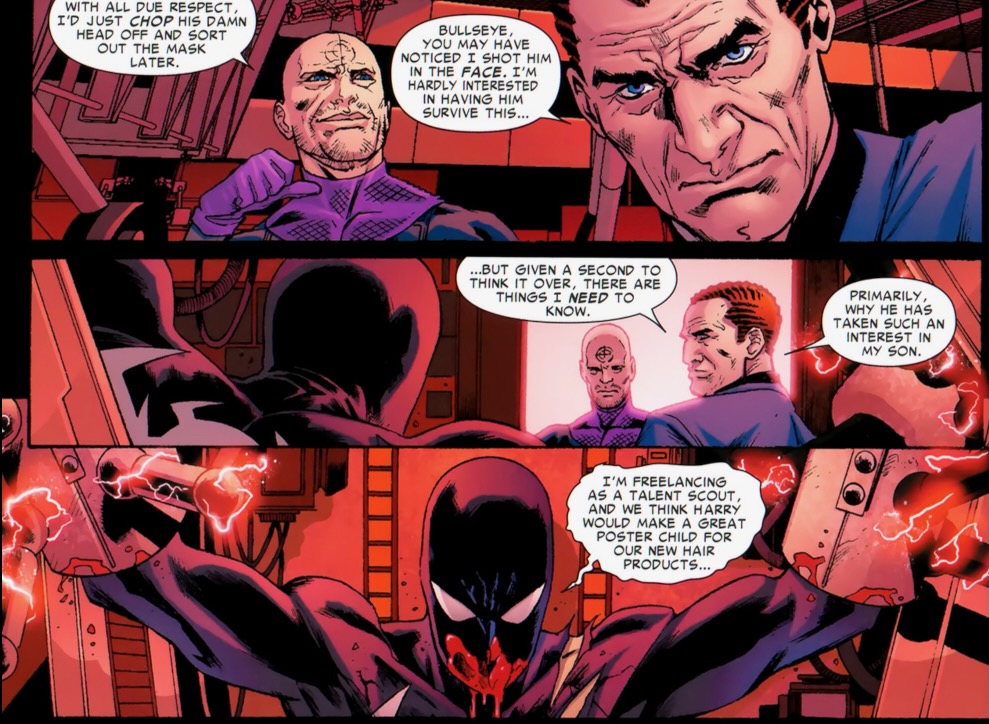 Spider-Man then tries to visit with Harry and Lily, but Daken recognizes him as an imposter (based on scent) and attacks. Spidey defeats Daken but Harry turns him in to his dad after all, and Norman says he knew Spider-Man was a fake all along. Bullseye hits him with some drugged arrows, and that weakens him enough so that he can be shot in the face by Norman Osborn and captured.