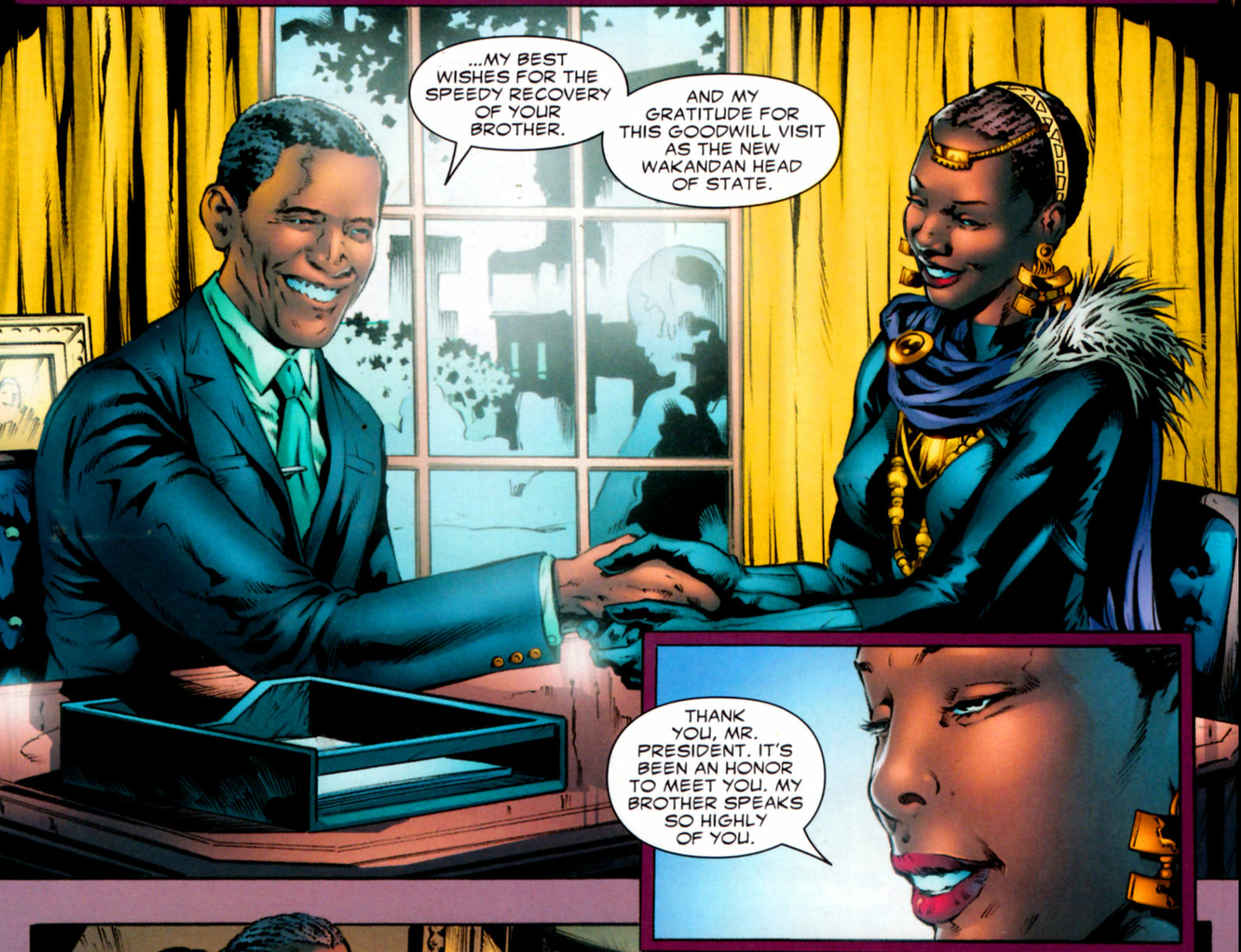 Shuri takes over Wakanda as the new Black Panther, but…Her story is just like most of T’Challa’s stories. She has the throne. Her people are full of revolution and rebellion. To help defend her reign, she meets with Barack Obama…