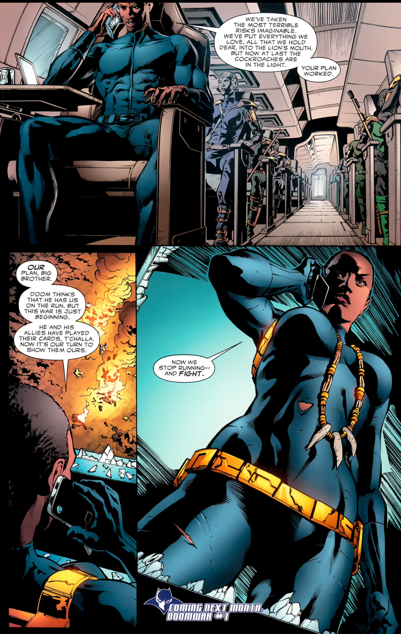 In the end, a political rebellion cell brings Doctor Doom into Wakanda and Shuri and T’Challa prepare for “Doom War.” This is the final panel to end this series: