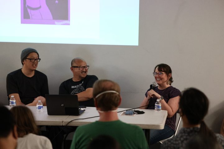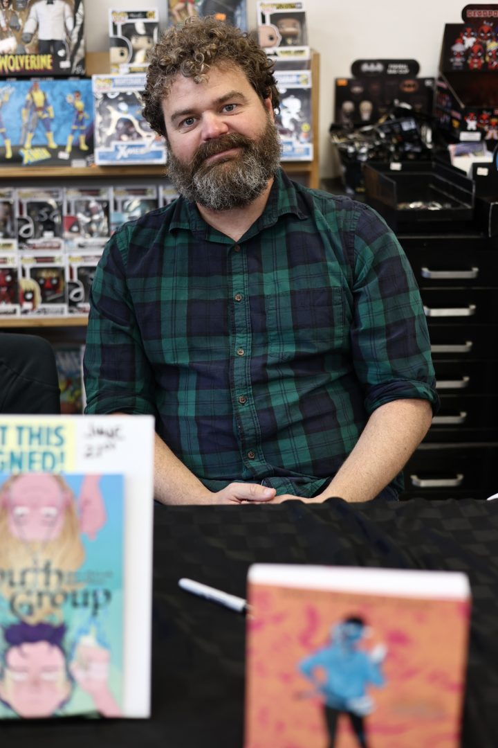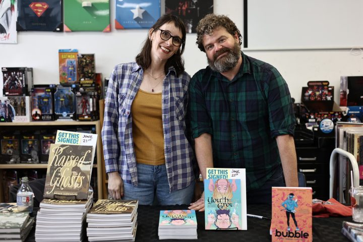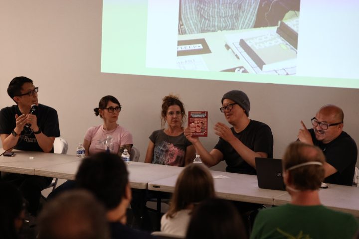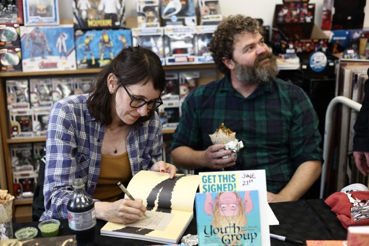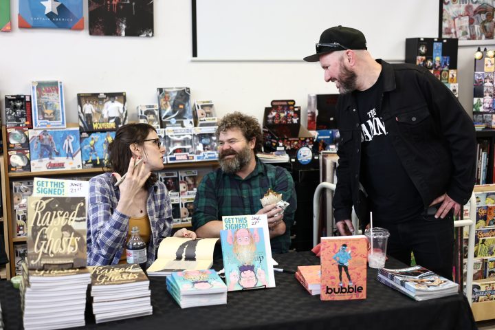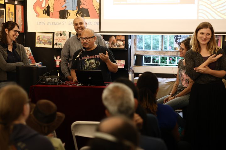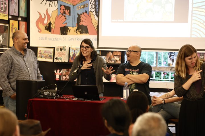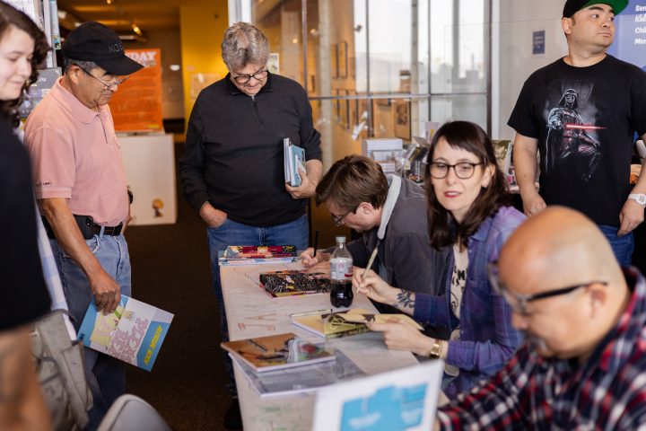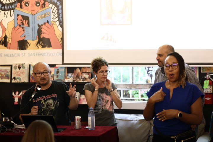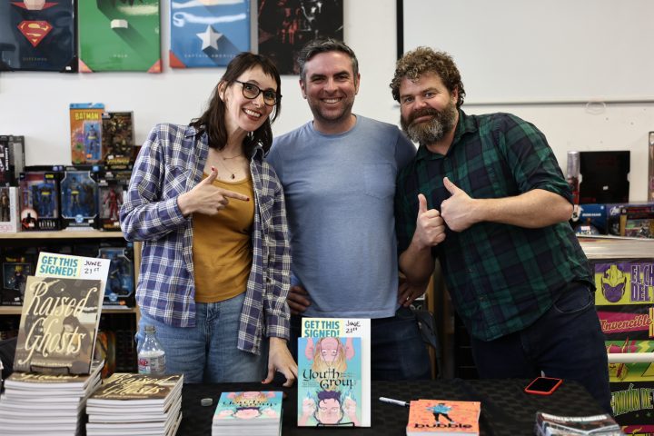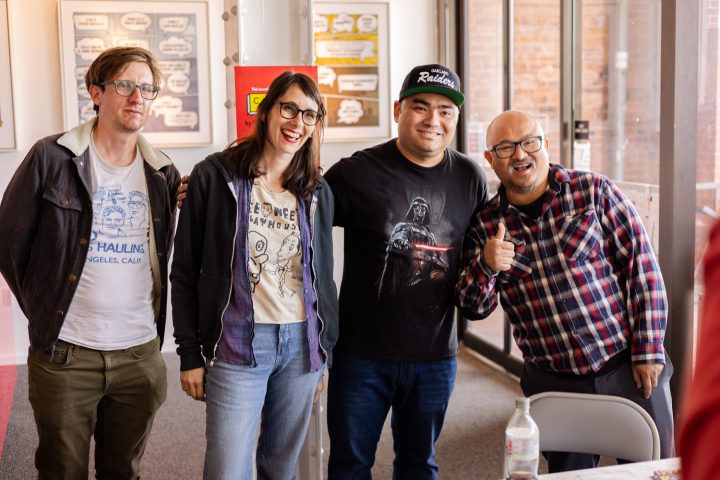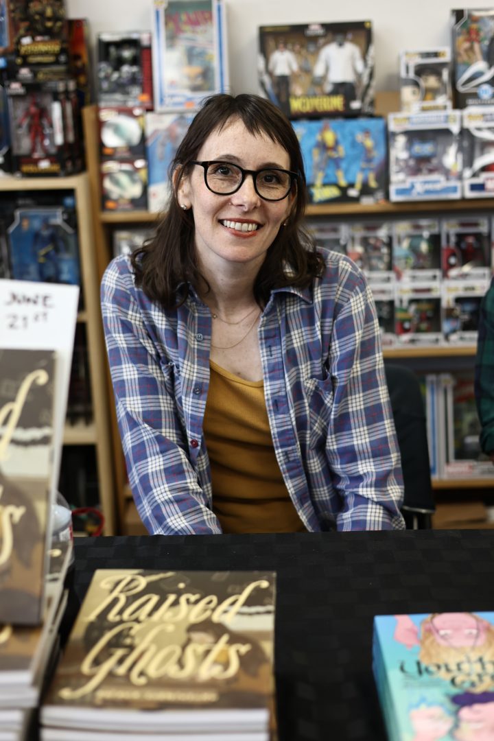 Briana Loewinsohn, is touring for her wonderful new semi-autobiographical comic, Raised By Ghosts (Fantagraphics, 2025), the recent winner of the Harvey Award for Best Young adult book. I caught a few of her signings and readings, which are ongoing until the end of October at other stops (find dates and locations here). I commend Loewinsohn for having her cartoonists friends and colleagues join her for panels and signings, making them festive and having a Bay Area indie comics espirit de corps of local cartoonists, which has been missing for quite some time at festivals and signings here! Labor day weekend, Sunday, August 31st, Briana, Gene Luen Yang, Julia Wertz, Jason Shiga, Raina Telgemeier and Wahab Algarmi shared a table and panel at San Francisco Zine Fest. One thing that struck me about seeing them all at the panel is they started out self publishing and became friends through tabling at cons and weekly drawing meet ups at Jason Shiga's house. And all are now established and highly accomplished with their body work, put out by professional publishers and their fanbases are growing constantly. Bruce Simon and Peter Hoey of Coin-Op were also exhibiting at SF Zine Fest. Saturday, August 23rd was the Silver Sprocket group reading of Briana, Julia Wertz, Wahab Algarmi and Thien Pham with Justin Hall in attendance. On Saturday, June 21st, a laid back and fun signing with Jordan Morris at Mission Comics with Thien Pham and Kirt Burdick in attendance. Earlier this spring, she shared an enlightening and humorous panel and signing at the Cartoon Art Museum with Thien Pham and Josh Pettinger. It's definitely worth it to attend one of Briana's signings/panels!