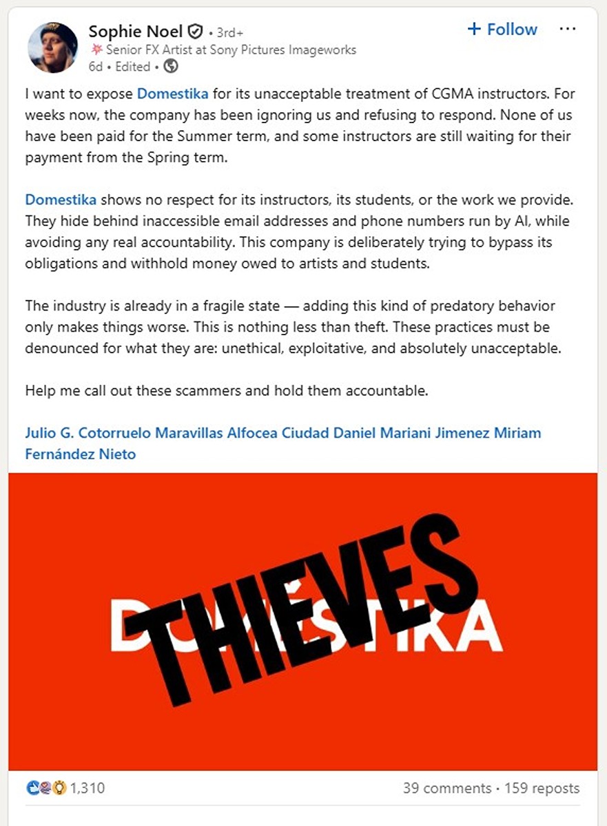 Sophie Noel, instructor of the Fundamentals of Houdini for 3D Artists and Senior FX Artist at Sony Pictures Imageworks, sounded the alarm in a post on LinkedIn last week, stating: