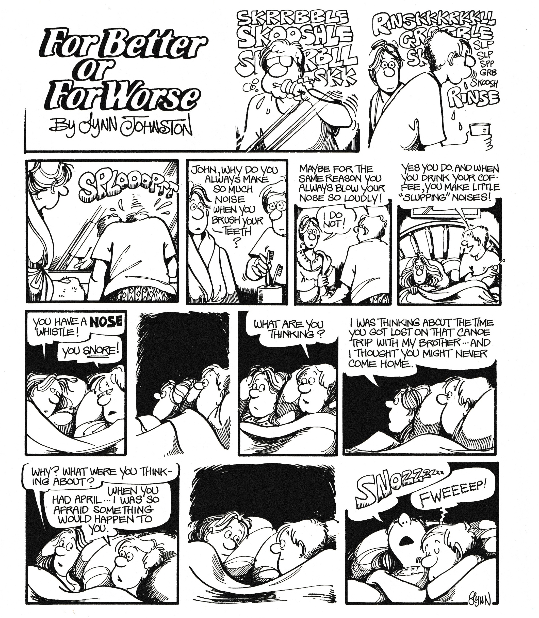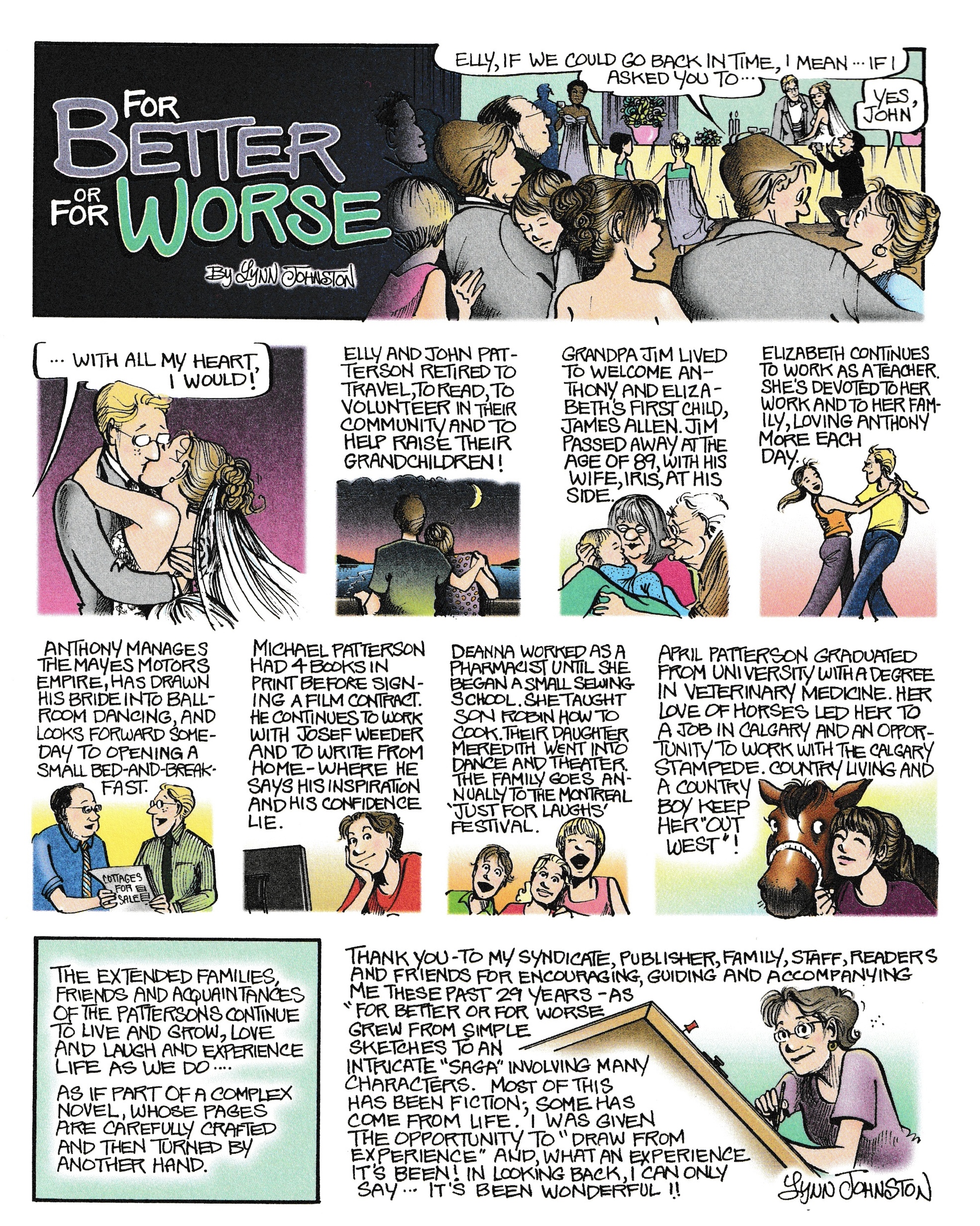 None of these personal struggles are reflected in For Better or For Worse itself, in which the Pattersons remained a loving nuclear family through years of newspaper-friendly small-town adventures. In more than one interview, Johnston mentions that the two issues she never wanted to work into the strip were child abuse and infidelity — perhaps not coincidentally, issues that significantly impacted her own life.
