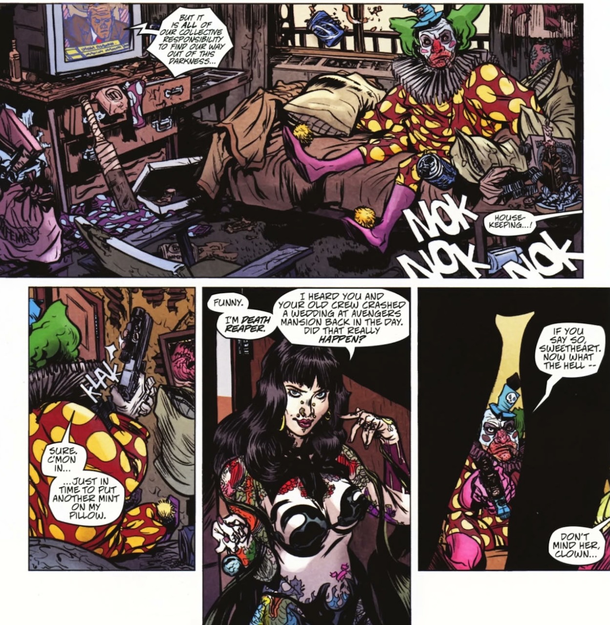 One of them dresses like Obnoxio the Clown. In fact, I’m tagging him as a character here because we haven’t seen him in years. I’m also tagging this as cosplay. Anyway, the dude calls himself “Clown” and he’s the half-brother of The Clown from Circus of Crime. Apparently his brother stepped down from the Circus and this dude, who is just called “Franklin,” took his costume.