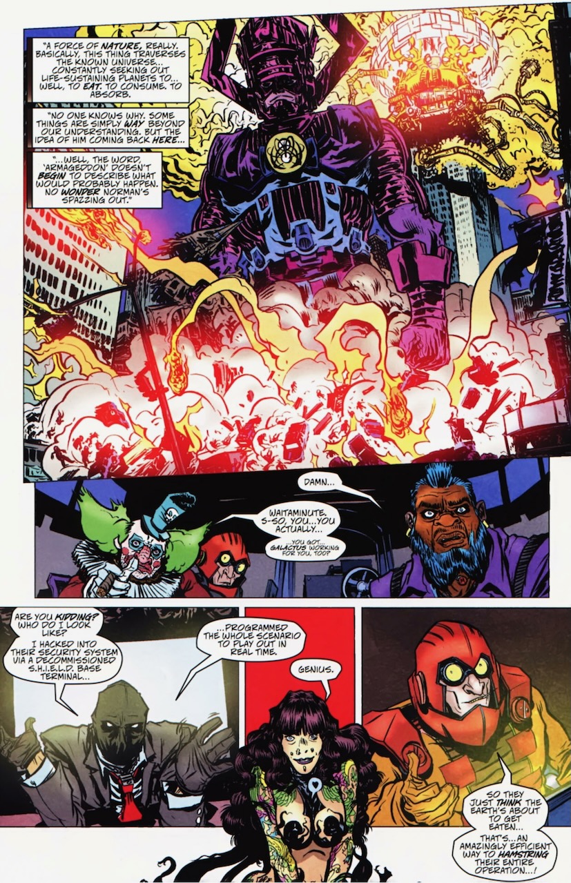We learn right away that they bugged (Dark) Avengers Tower and wants to take down Norman Osborn. (Suspend your disbelief that the clinically paranoid Osborn wouldn’t regularly sweep the Tower for bugs.)