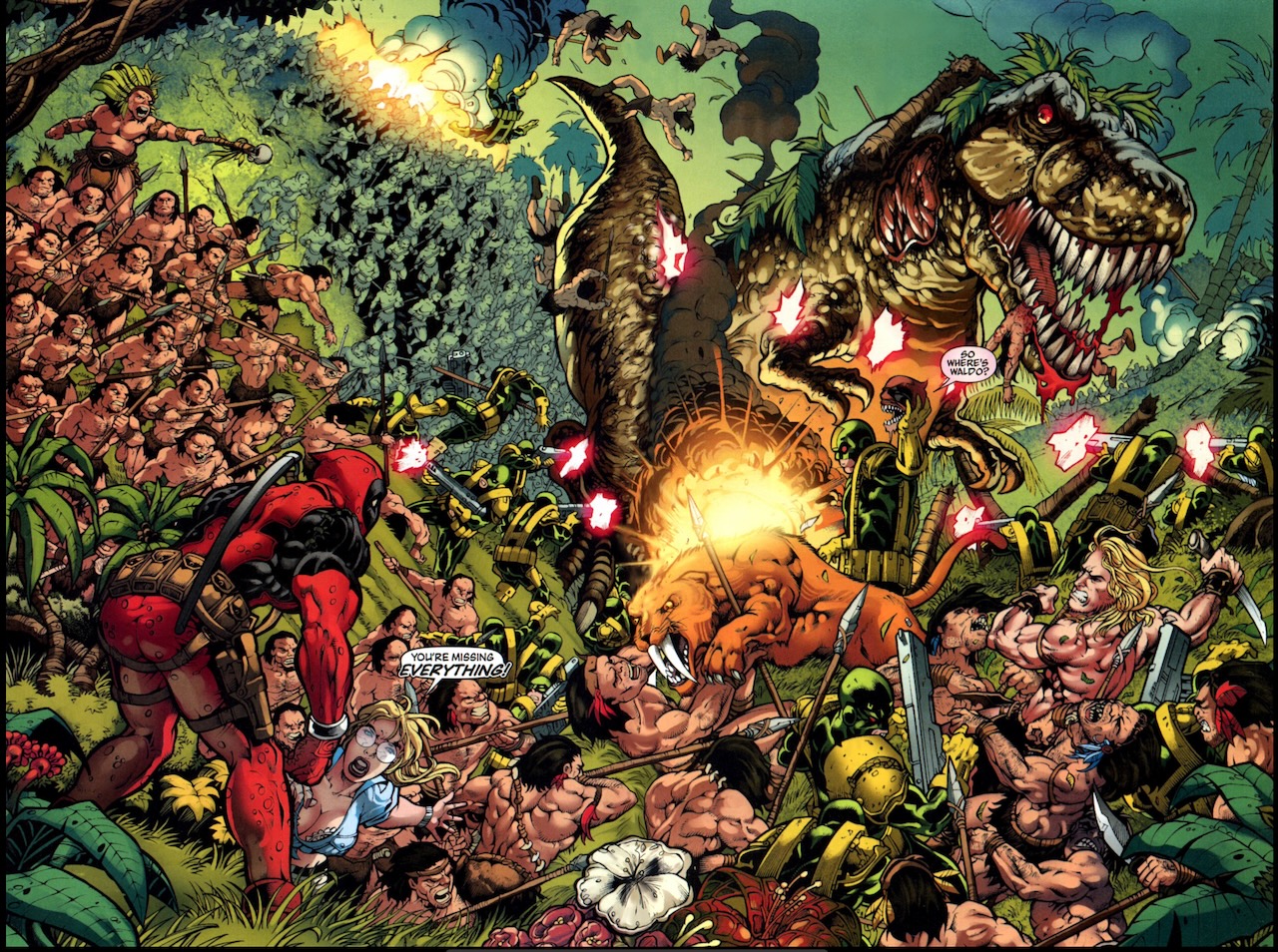 Deadpool has to fight Headpool’s tribe, dinosaurs, zombie dinosaurs, and Hydra troops (who also want the head)…