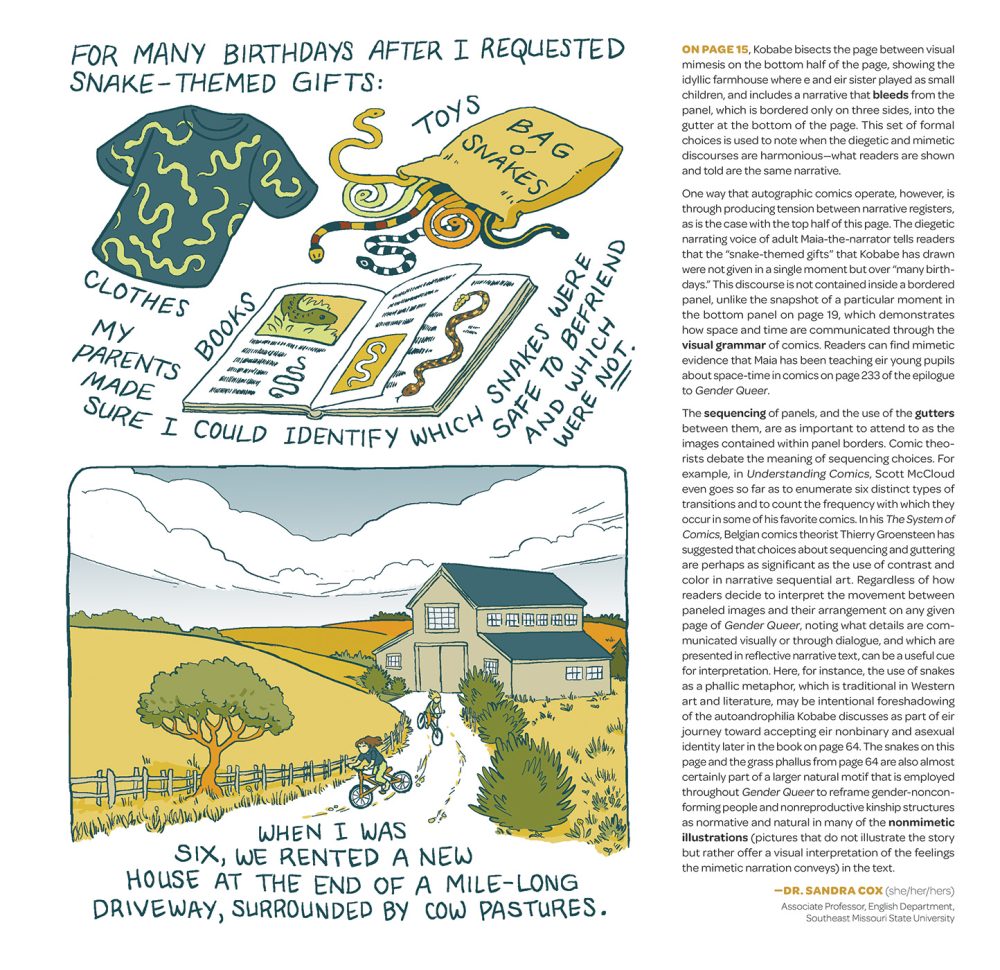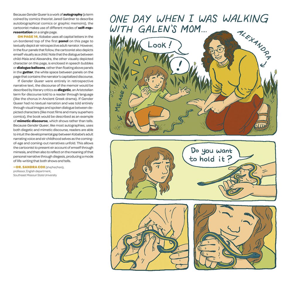 “I’m extremely happy that Gender Queer has been included on so many college syllabi in the years since its publication. I’ve seen it taught in English classes, Women and Gender Studies, Comics, Memoir Writing, Graphic Medicine, and more. One of my hopes for this annotated edition is that it will offer an even richer resource for students and teachers studying the text in class, as well as anyone else interested in a close reading of the book,” e said.