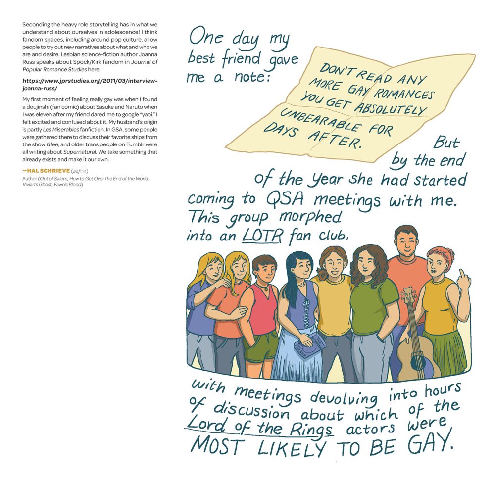 “There are comments on the color design process, on comics craft, on family, on friendship, on the touchstone queer media that inspired me and countless other people searching for meaningful representation, and on the complicated process of self-discovery,” e continued. “It’s been almost seven years since I wrote the final words of this memoir; revisiting these pages today, in a radically different and less accepting political climate, sparked a lot of new thoughts for me as well. I hope readers enjoy this even richer text full of community voices.”