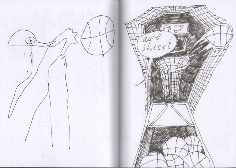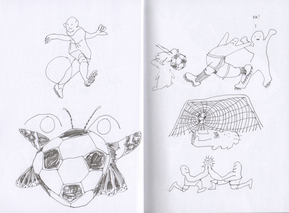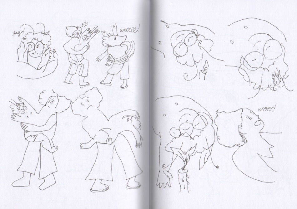 In Flea, the artist prizes the intimacy of a small book, with a few scant images per page — I’d normally call them panels, but should emphasize there’s no panel borders — that accumulate into scenes over the course of page turns. A reader must physically engage in the experience of the object, and so become entangled with Flea, the character, as she moves through the world. Characters exist as if drawn in a single line, reducing them to shape, like a more shambolic take on Saul Steinberg’s elegantly drawn jazz forms. Scenes flit about in time, beginning with her as a child, being bad at sports. Each segment comes off more like a short poem, with each page indicating a break between two-line verses, than a chapter in a novel where the tiers of a page analogize to paragraphs.