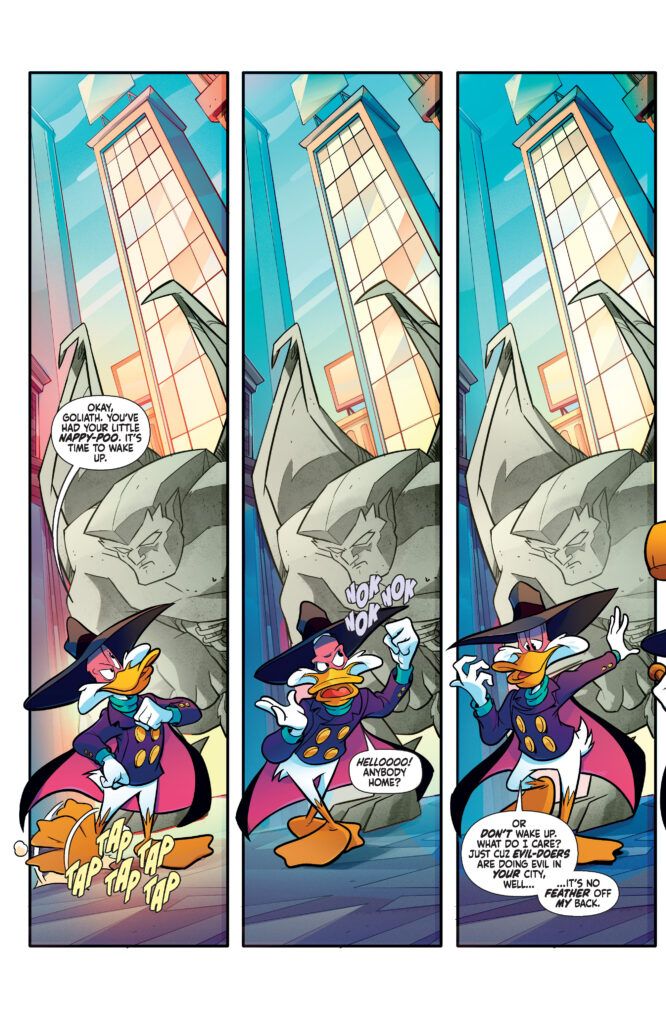 What makes Gargoyles-Darkwing Duck #2 so compelling is the forced alliance between these disparate heroes. Darkwing Duck realizes quite quickly that he won’t get far without the help of Elisa Maza and Goliath. However, a significant complication arises: the head of the Manhattan Clan is down for the count until sunset. This leaves the unlikely trio of Darkwing, Elisa, and a dormant Goliath with half a day of downtime to contend with while the enemy prepares her next move.