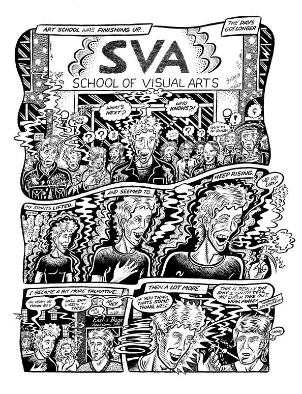 And also in art school you're there to do things that you don't necessarily want to do...like the thing that really got pushed on me early on was autobiography, and it was the first thing I did that got over with him, too, which was a strip about living on Avenue B. Art still knocked it for the drawing, but he said that the writing was great. So you know, I was an art student. You should always be paying attention to what is it that they're telling you what you're good at, and autobiography was what was being pushed on me. So even though I didn't really love autobiography ... back then I wasn't a big Harvey Pekar fan, you know? That was a little bit too dull for me. I wasn't that interested in it. But the whole thing of doing, like urban crime stuff about where I was living, that's something I sort of fell naturally into. So that was the other thing that was good about it, you know? You find your way.