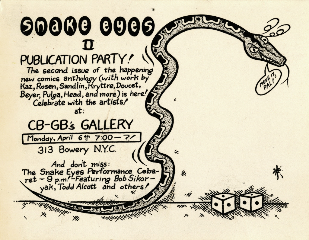 To my great surprise, Kaz got on board, and we became partners in the project. We called it Snake Eyes, and in the moment it was really the best thing that could have happened. Because it forced me to take responsibility for something that had a lot of people contributing. I had to really deal with a lot, making it all happen. Kaz and I both edited it together, but, ultimately, I was the one holding the bag for it. I laid out the book, signed off on each issue.