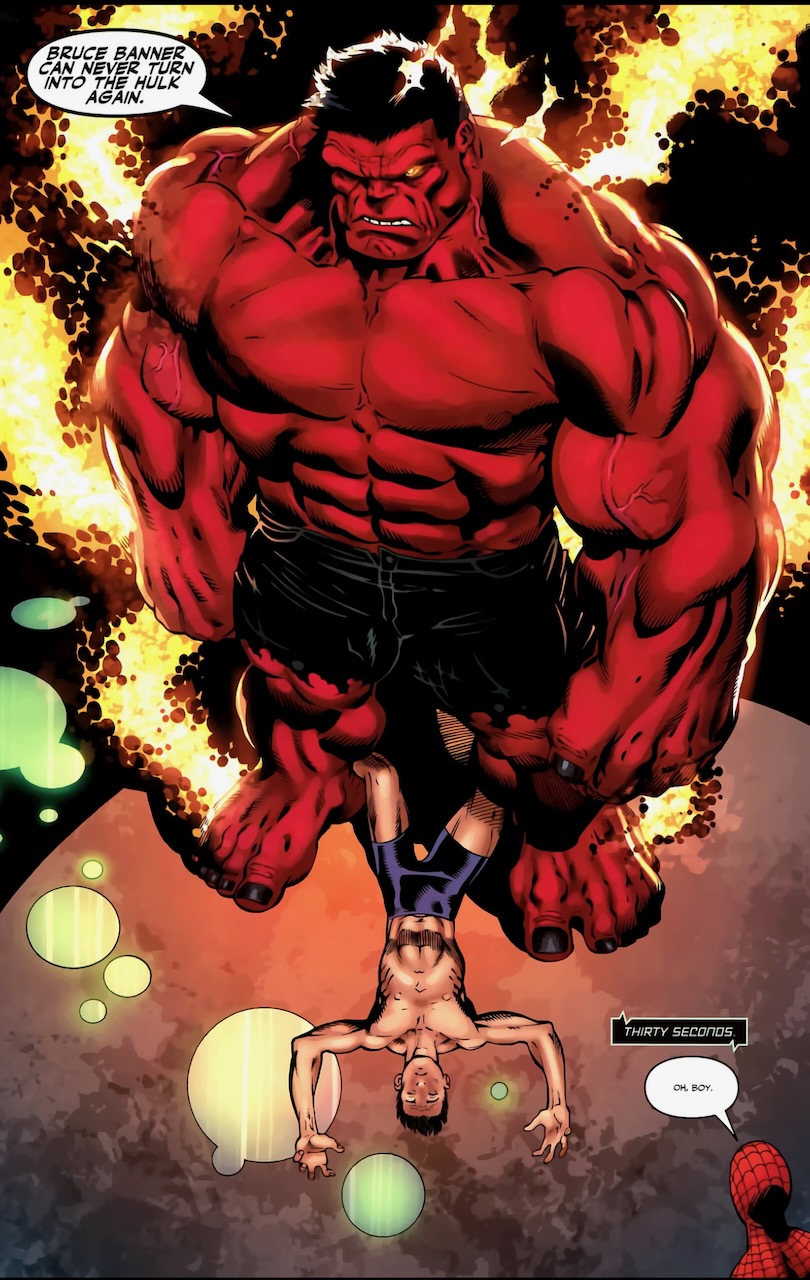 Hulk and Red Hulk fight again, but this time Rulk says that in addition to eye blasts he also has the new ability to absorb gamma radiation–and he cures Banner.