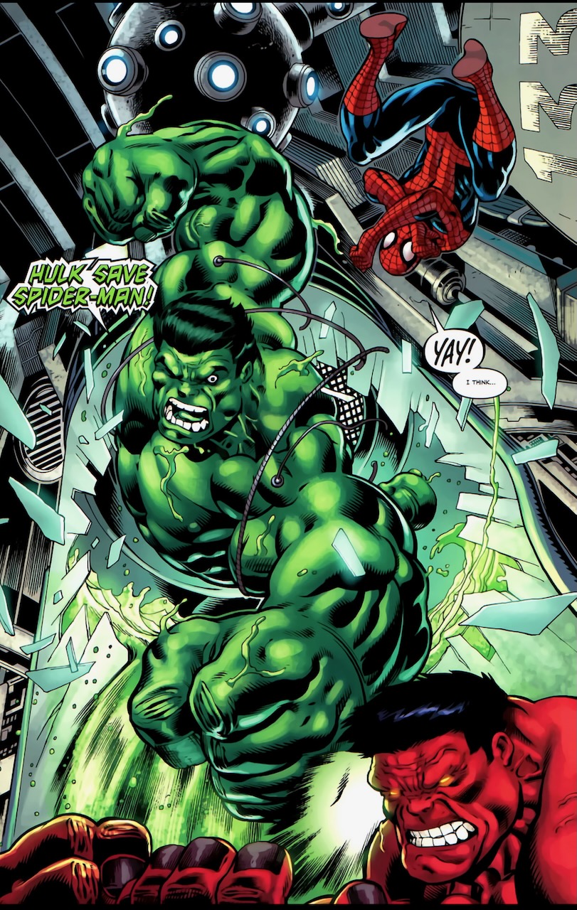 Urich and his photographer, Peter Parker, follow the leads and learns that Advanced Idea Mechanics is running Gamma Base under the direction of MODOK. Doc Samson is amped up and hypnotized by MODODK. Shulk fights Samson while Spider-Man fights Red Hulk.