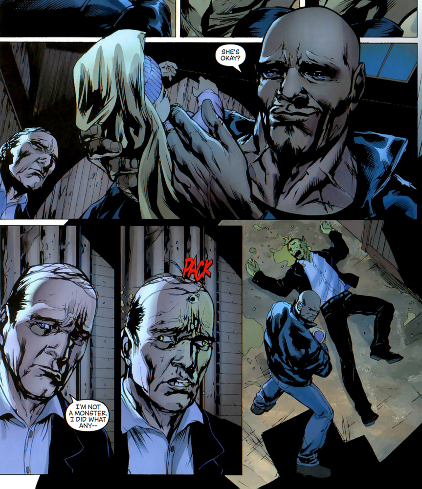 Osborn reveals that HAMMER has 74 skrull prisoners of war, and the interrogations begin. They learn that the skrulls operate a portal to their homeworld in an old warehouse, and Luke and HAMMER stake it out until “Jarvis” shows up and turns the baby over. Then Bullseye shoots him in the head.