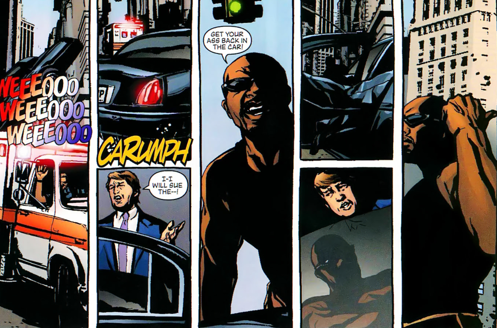 After his daughter is safe, Luke reneges on his deal to work for Osborn, grabs the Wrecker’s crowbar, and takes on Bullseye and Venom.