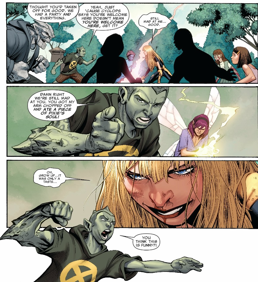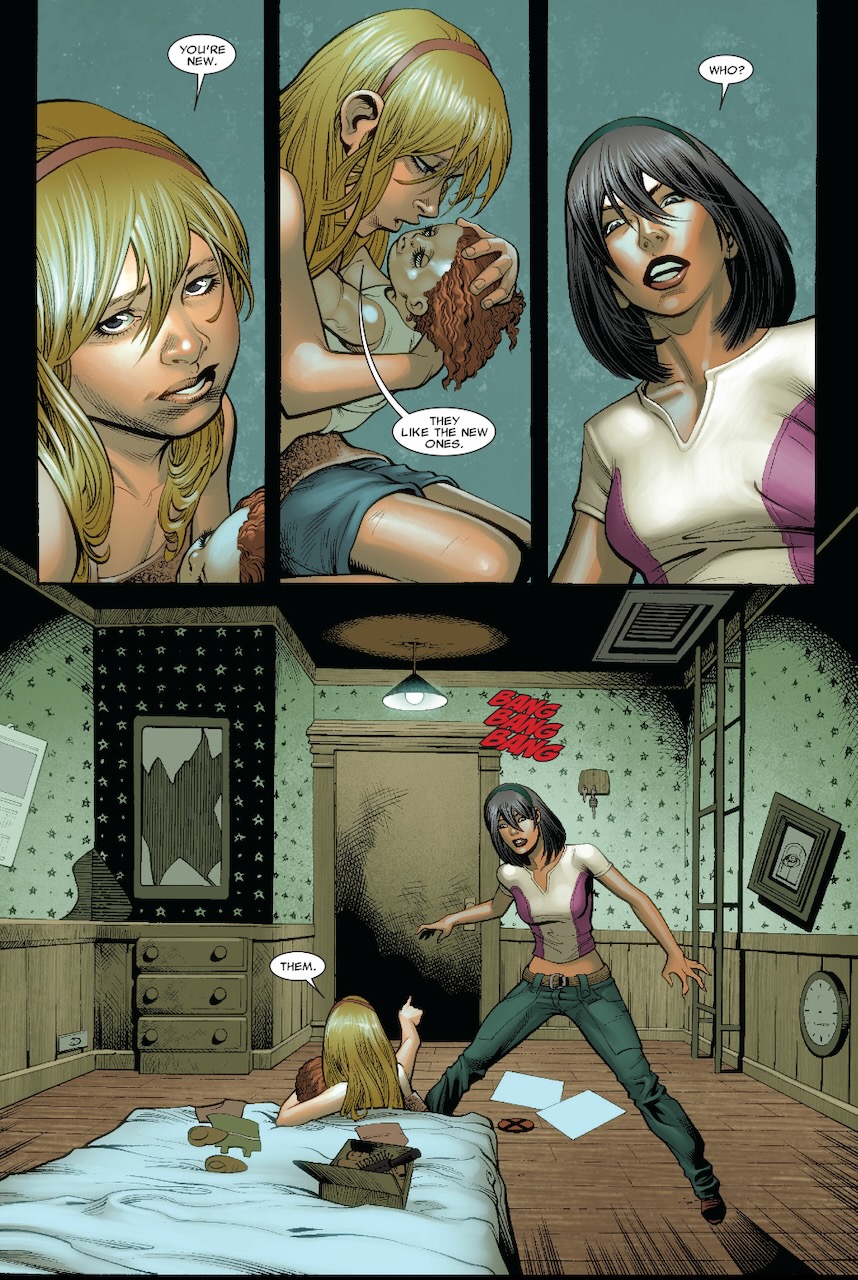 The opening is like a horror movie. Karma is in Colorado, and crouches next to a little girl. She tells the girl, Marci, that she’s been looking for her and Marci responds that Karma is new and “they like the new ones.” A creature starts to knock down the door, and we shift to the California X-Men base, where Magik teleports in, injured, and gets a less-than-warm welcome from the former members of the New X-Men who only know her as the woman to took part of Pixie’s soul.