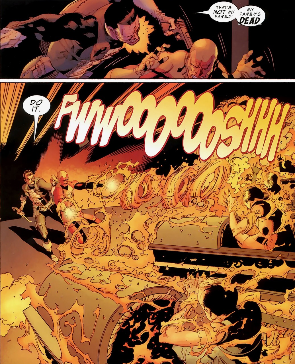 For the big finale, Punisher tries to rescue Bridge and is confronted by his family, resurrected by Hood. But rather than allow this to stop him, Punisher has Firebrand burn them “alive.” He prevails.