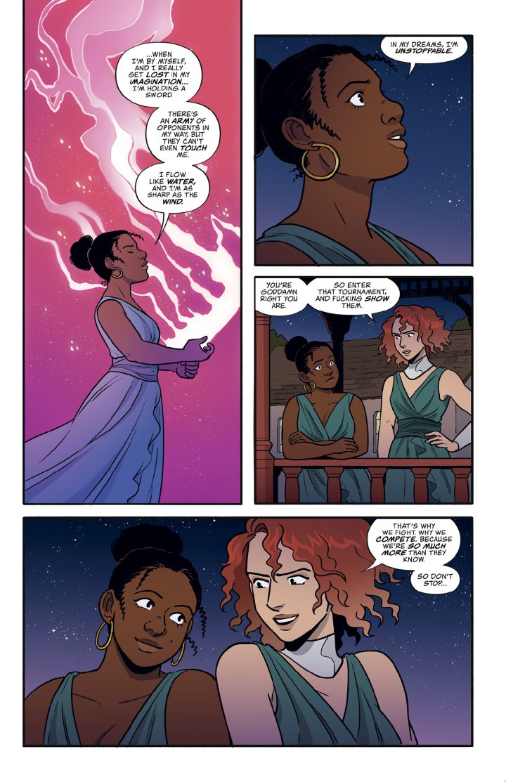 Renegade Royale is the sequel to 2021’s Renegade Rule, by the same team of writers Ben Khan and Rachel Silverstein and artist Sam Beck. The first book introduced the four-woman protagonist team as they made their mark in a futuristic gaming championship. This follow-up opens with most of the team still riding high from their second-place success; but one of their number, Tonya, is plagued with self-doubt. She blames herself for the gang’s failure to take the gold the first time around – and now, with a bigger and badder tournament on the horizon, she owes it to her teammates to pull herself together.