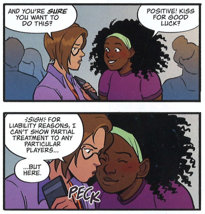 The all-round niceness of Renegade Royale extends as far as the comic’s central antagonists, KJ and Leaf Chesterfield. These two are defined as villains merely because they roleplay as villains. Where the four protagonists talk like people playing a game (“Maybe that meteor has power-up energy like in the game lore”), the Chesterfields throw themselves into their vampiric personas, delivering all of their lines in-character – in wrestling terms, they follow kayfabe – and becoming the Anne Rice LARPing douche nozzles so despised by Sasha. Outside of the game, though, KJ, Leaf and Sasha are free to meet up for a friendly coffee-shop chat; Leaf proudly sports a non-binary pride badge, confirming that in real life, all are on the same team.
