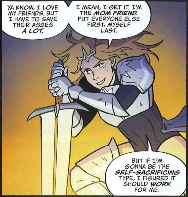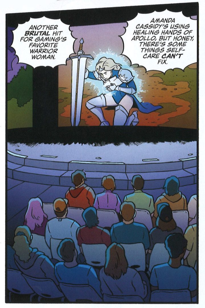 Like its characters, Renegade Royale’s heart lies in the Neverland-like pleasures of the game-world, where everybody has a sassy quip at hand, death lasts only until the next tournament, and the star prize is a self-esteem boost and the confirmation of a queer relationship. That said, there is little concern here for the exact mechanics of gameplay; nobody will confuse Renegade Royale for DIE, whose fictional RPG was so thoroughly-developed that it was released as an actual game. Only one specific mechanism – the opportunity to activate a superpowered mode after scoring enough kills – plays any role in the plot. Beyond this, the VR realm is one in which Tonya and company can enter a fray with whatever swords, guns and magic shields the latest action scene demands.