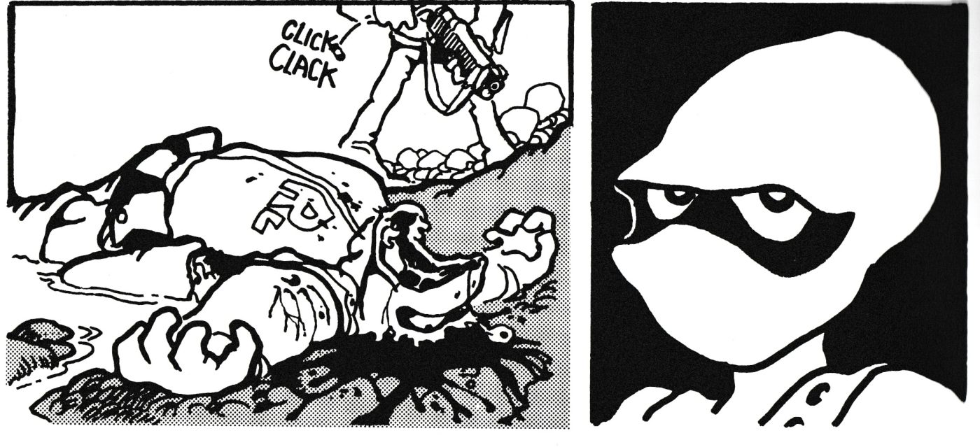 He also used his strip to address political issues. (His take on Kent State was a duel between reptiles, one armed with a brick and the other a machine gun) and to work over personal concerns (a troubled marriage; a father’s death.2 He achieved poignant episodes, like “River Meat,” in which a corpse wonders, “what I was before I got to be a bobbing, bloated, floating thing.... I might have walked on top of the actual ground and waded through autumn corn. I could have heard a different drum.” And he presented deconstructive riffs, startling in their originality. “Self,” for instance, plays within an artist’s mind, with characters investigating the stored memories which triggered their creation. In the next-to-last panel, they peer out through the eye that drew in the perceptions that begot them. Then the point of view reverses; the last panel, shot from the outside, reveals the full being in whose eye they stand: the author as a teary child, naked but for a strait-jacket, to whom electrode-like wires attach.