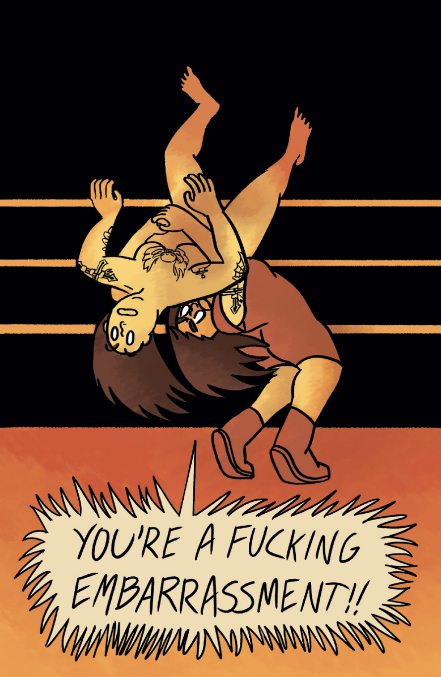 Despite the heavy and potentially grim nature of the issues at the core of Soften the Blow, Audrey’s story is ultimately one of hope and of joy. Fans of wrestling know this arc well. There’s a wrestler. You love them. They offer something, whatever it is, that you can identify with. Maybe you can see a little of yourself in them. Maybe you just like their moves. Whatever it is, they’re “yours.” Sooner or later, they’re probably going to get locked into a pattern of loss. They lose their belt, maybe they lose their hair, maybe they lose their mask. They just can’t seem to get a break. They take loss after loss, some humiliating, some close calls, maybe even some as the result of nefarious actions on the part of their opponent. The deck, it seems, is stacked against them.