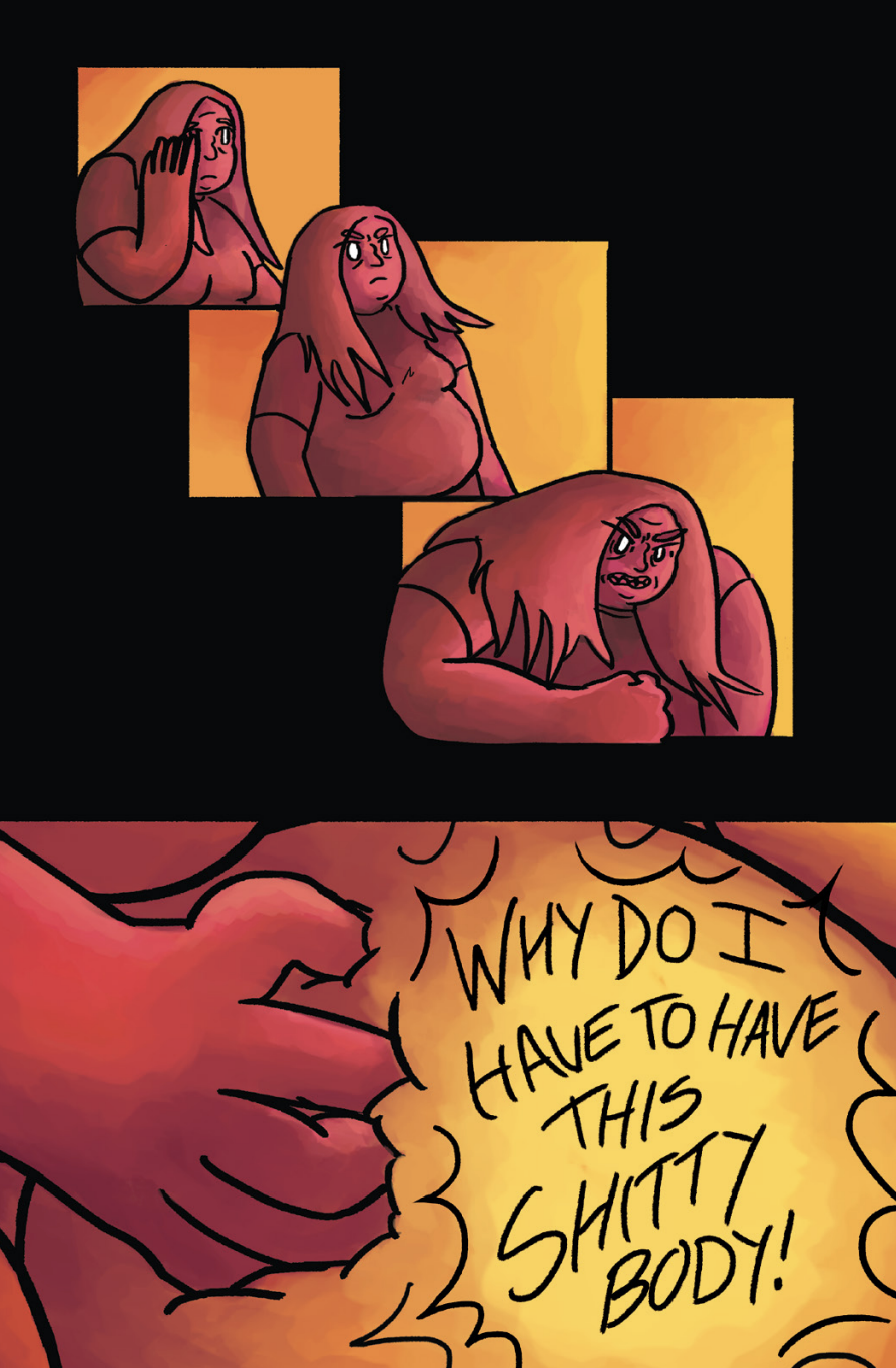 Generally cartoony — at times reminiscent of slightly more polished early Hutch Owen-era Tom Hart — and pleasantly rough around the edges, Tarleton’s art shines in its depiction of internal struggles. It can be difficult to place things that can’t actually be seen on a comics page, but in Soften the Blow, Tarleton deftly depicts the past’s lurking trauma, dysmorphia’s gnawing agony, and, in an incredibly emotionally affecting ending, the transcendence of joy and acceptance. Generally, I prefer comics with gutters and grids, but Tarleton uses the layout of Soften the Blow’s pages as another tool to communicate the intangible. A shark (representing “Megalodon,” Audrey’s former in-ring persona) plows its way through a field, Audrey’s body undergoes physically impossible contortions, even the mundane act of a haircut is given an entire page, the time-lapse of the cut giving weight and heft to Audrey’s emotional state.