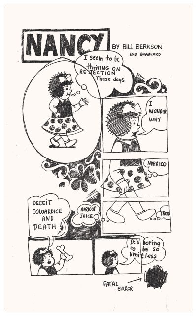 I love the loose, reckless feeling of Brainard’s art. He draws freehand and his figures often distort as a result. A few fudged drawings are scritched into oblivion; others achieve a tentative, airy vibe that is fascinating for what it doesn’t contain. The 12-page strip “The Nancy Book,” by Padgett and Brainard, breaks a traditional comics narrative into a million slivers; the reader admires the rubble as they take a cautious stroll through it all. Its splash page, with a supe-hero drawing aborted and scribbled out, defies all principles of professional style. The seventh page, with a proud, striding Nancy who proclaims: “It freaks the atmosphere of my glands” (no period) is the best page of comics art I’ve seen this year.