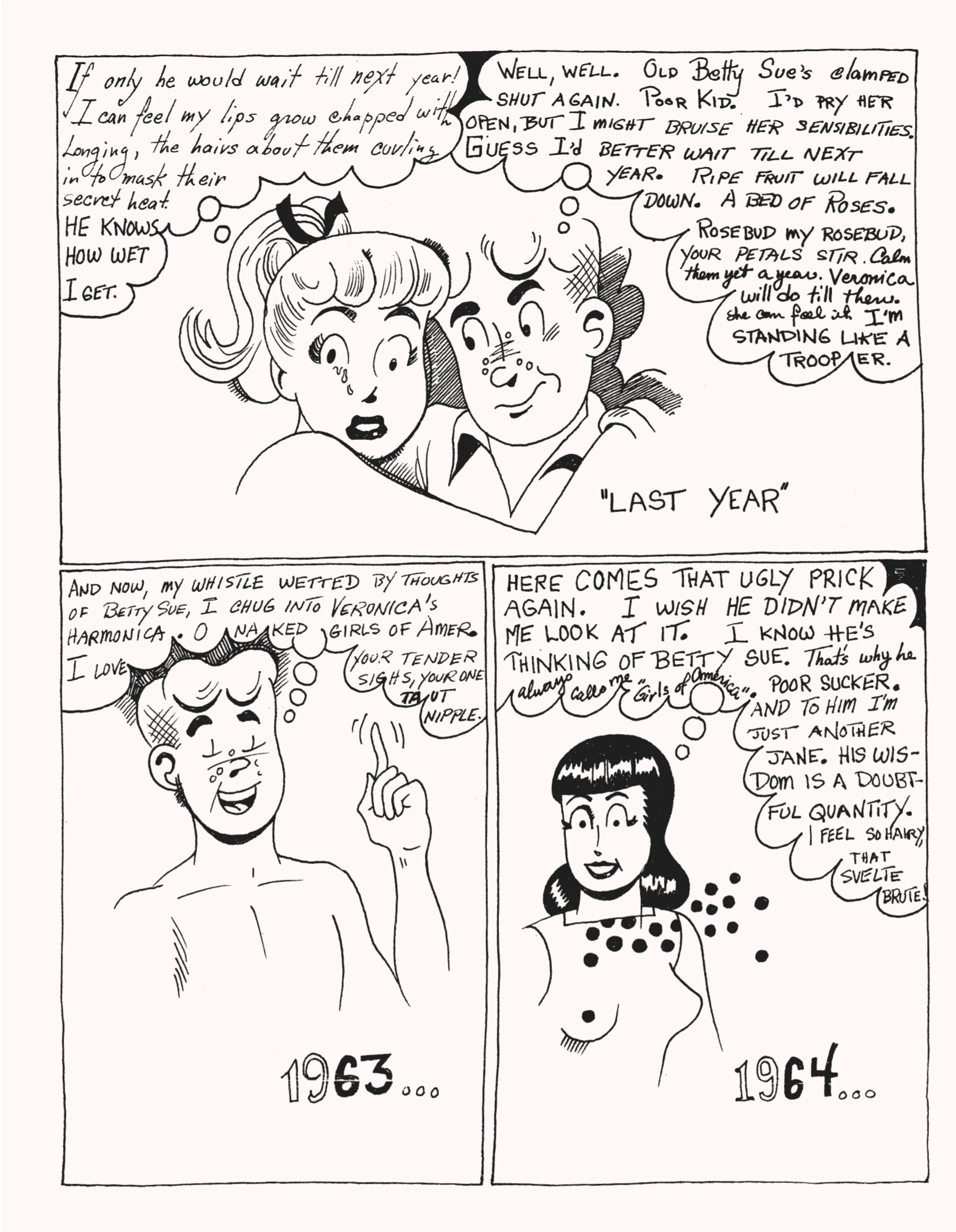 The adolescent cast of the Archie comics universe is pilfered in the confrontational “Betty Sue’s Biplane,” a collaboration with Dick Gallup that lays bare the erotic subtext of these wholesome teen comic books. It’s a seedy experience, with Brainard’s suggestive imagery (which uses open space as a virtue) and blurring of other comic-book genres into a heated evocation of male sexual arousal. Unlike Crumb’s sexually explicit work, this has an anthropologic detachment that makes its characters’ horniness a parody of desire — something to view with caution and concern rather than excitement.
