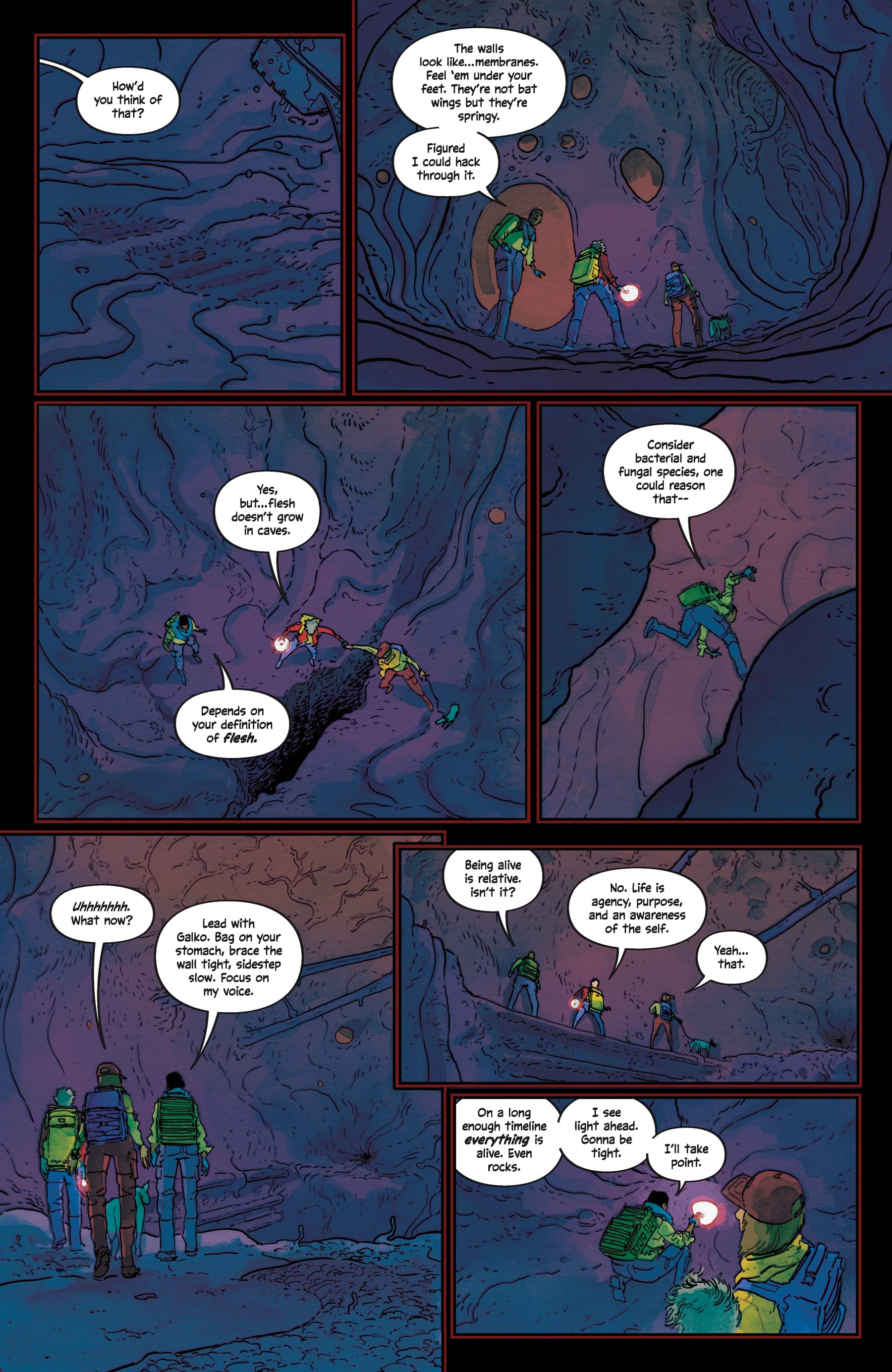 The series is so far comprised of two parts, with each part made up of four issues. Each issue is also told from a different perspective, usually one of the scientific crew that we follow along their journey. As we go further down the rabbit hole of this landform/sentient being, each shift in perspective reignites the horror and larger than life questions at the heart of the series: Are we to blame for what’s happened to the world? What’s the point of all this? Are we trying to understand the world around us or is the world trying to understand and toy with us?