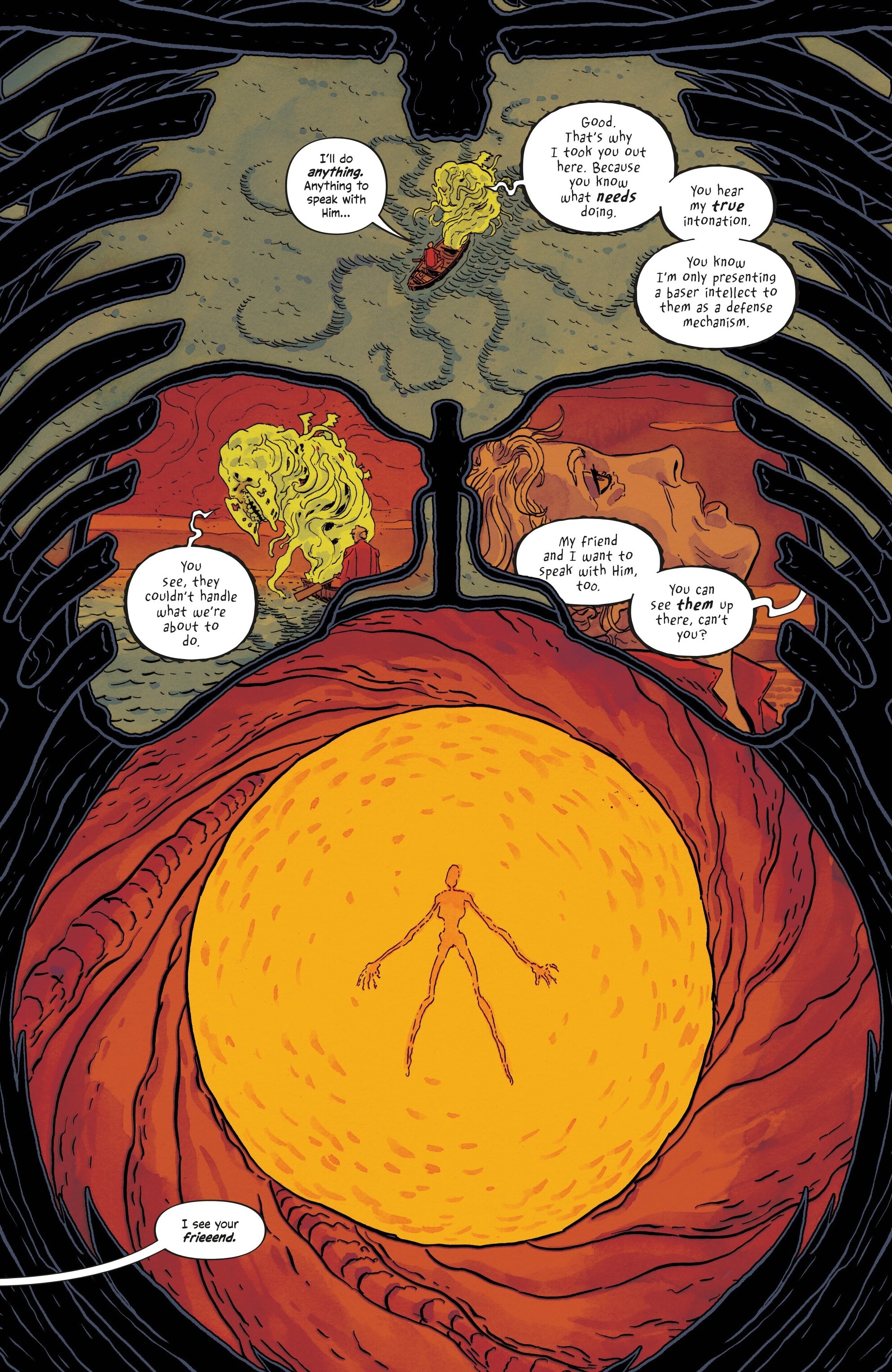 Noticeably, the art of the series is not fully formed to communicate these ideas from the start. Sherman improves on the character designs, their expressions and the complexity of the layouts with each issue. However, the color is excellent from the start, mixing warm reds and yellows with greens and blacks to give the world a sickly appearance, like we’re not only inside something alive but something that is clearly dying. The characters are thus framed like parasites, moving between the body as alien forces as the larger entity gets sicker, scarier and a bit gross.