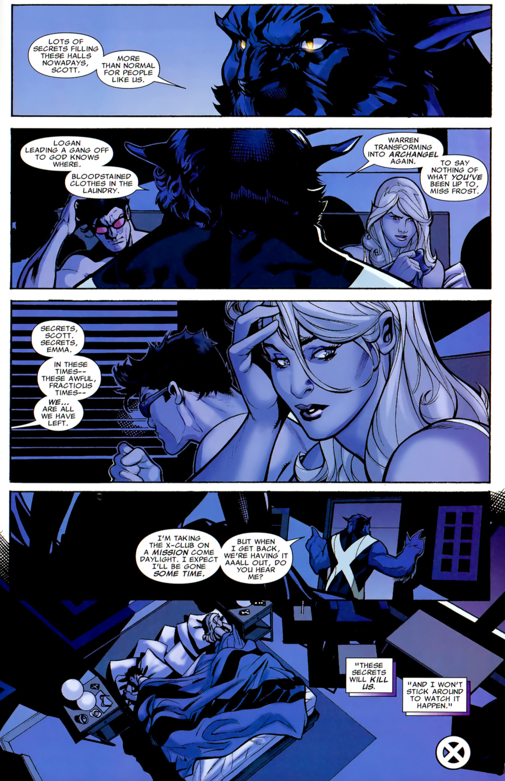 Domino and Psylocke join the team. Across the issues, we see the “team” broken down into smaller alliances who all act without the others’ knowledge. Hank McCoy throws some speechifying at Scott and Emma about it in the end.