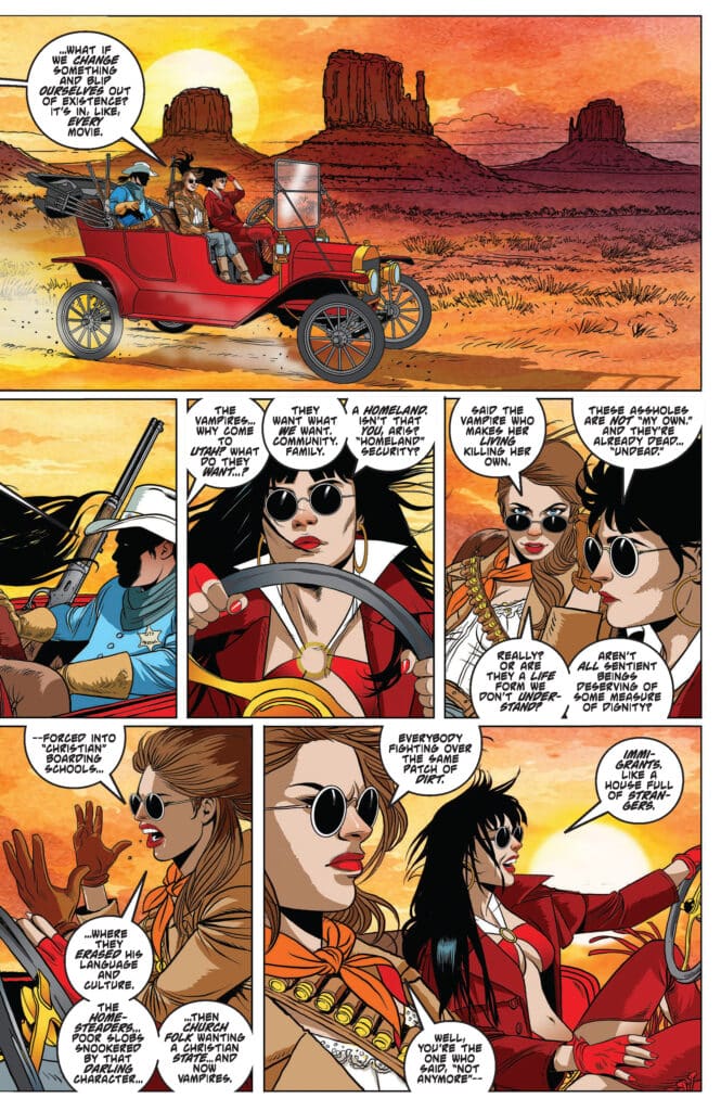 What readers should prepare for in Vampirella #12 is a narrative that finds its heart in a “stark choice.” Trapped in the past, Vampirella discovers a rural town that has been systematically overtaken by a deadly gang of blood-sucking lawmen. The hierarchy of the town is inverted, with the very people sworn to protect the citizens serving as their predatory masters. Vampirella must decide whether to use her own Vampiri abilities to liberate the town or remain in the shadows to prevent a catastrophic interference in the timestream.