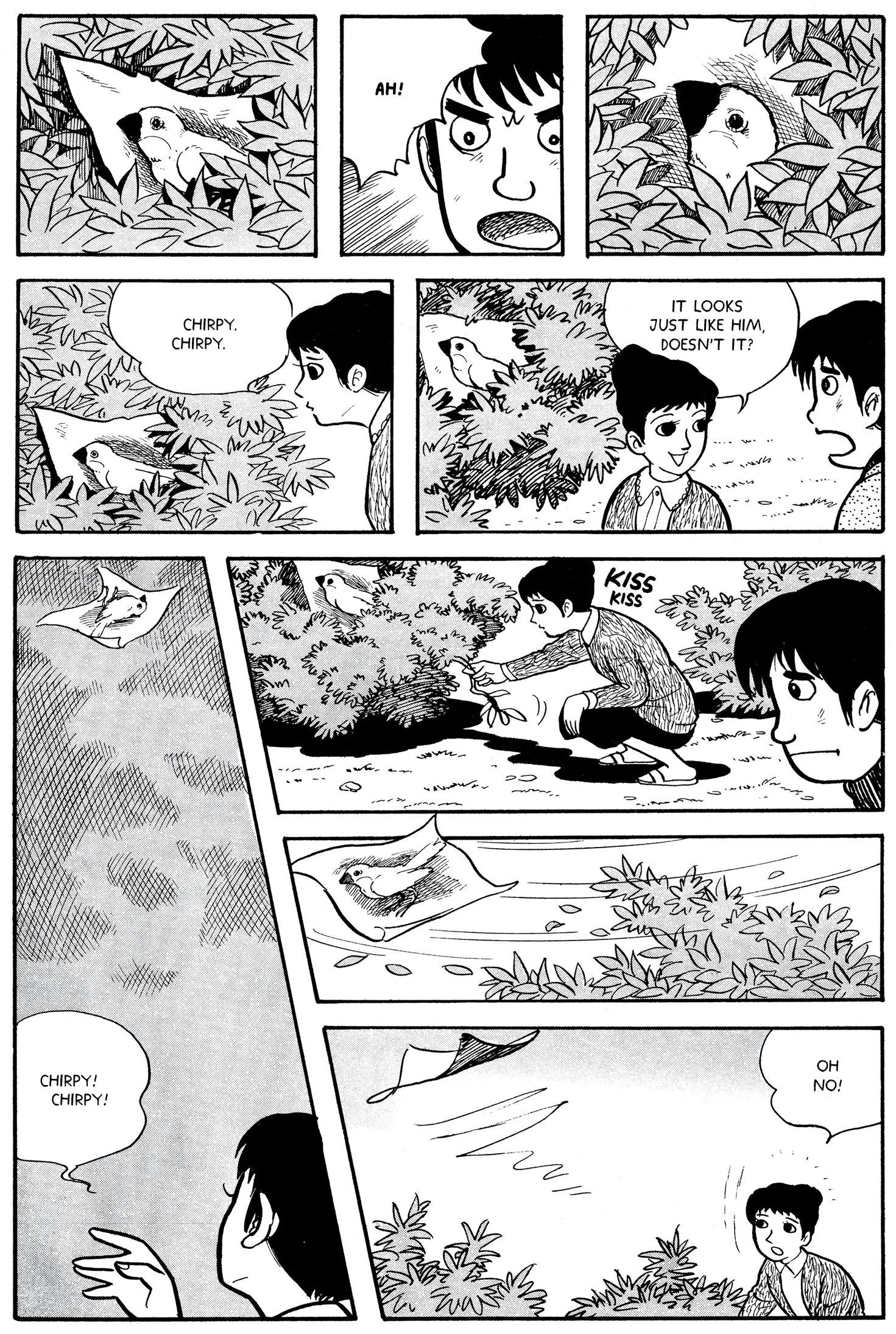 From "Chirpy," as collected in D&Q's The Swamp.Energized by the freedom of making art without need of entertainment, he next created "Chiko" ("Chirpy"). Considered one of his masterpieces of the period, he drew from his own lived experience. Tsuge tells a story of when he was living with his girlfriend Kokeshi. Tsuge accidentally killed her pet sparrow by putting it in a cigarette case. Terrified at watching its bright red beak slowly turn white, Tsuge buried the bird in a neighbor’s garden then lied to Kokeshi when she came home, saying the bird had escaped. Tsuge said the story happened in exactly that way with the exception of the burial; in real life he simply tossed the dead bird into some tall grass.