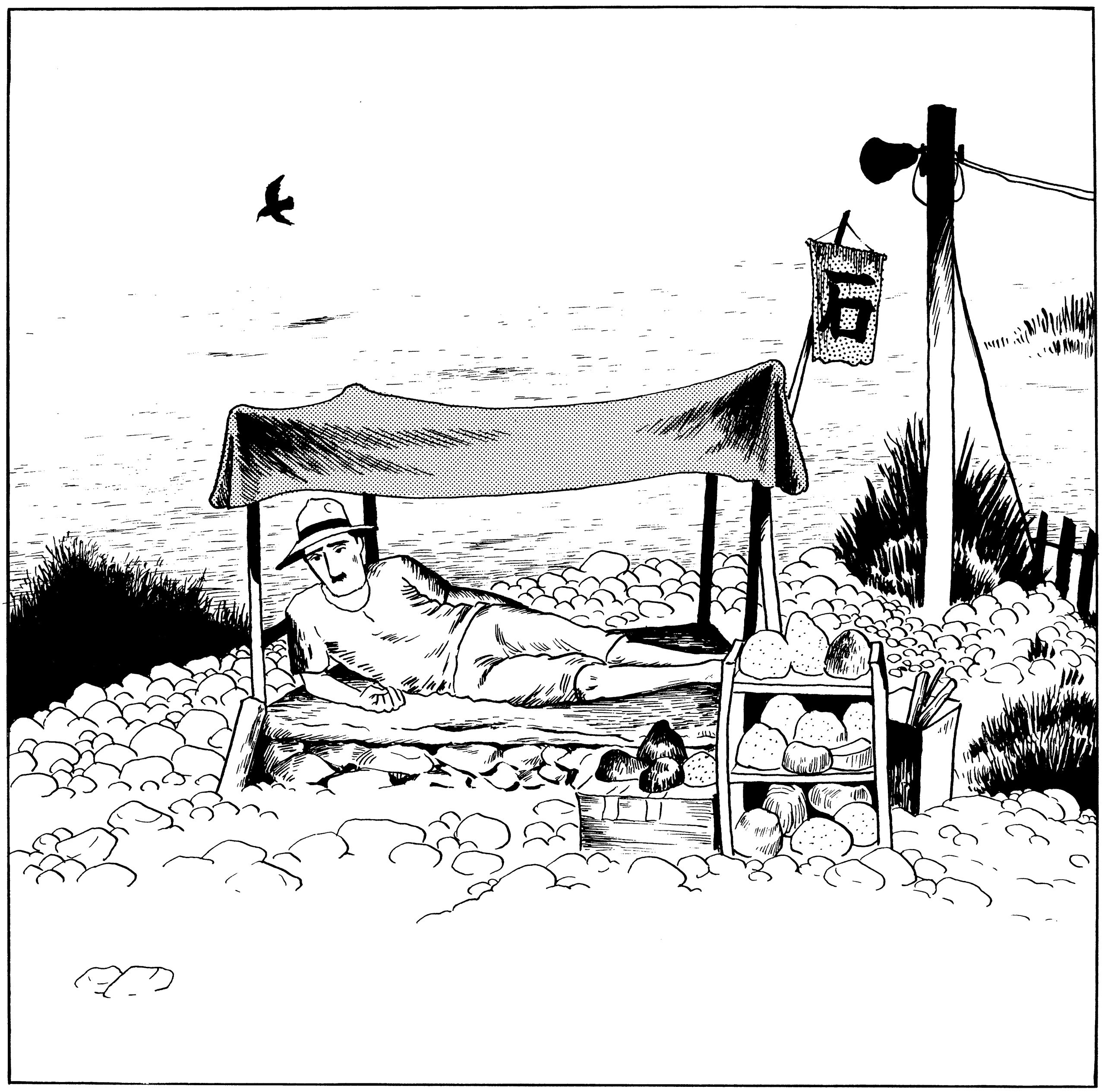 In 1985, Tsuge began a series called Muno no Hito (The Man Without Talent) featuring a once well-known manga artist whose work has declined. Taking pride in his reputation as the “artistic manga artist,” he refused paid work he thinks is beneath him. This leaves him to a state of dire poverty, and he begins exploring other occupations. He tries his hand at dealing in antiques and used cameras but fails at every business attempt. He finally sits on the shores of the Tama River, gathering interesting stones and trying to make a living selling them. Berated by his wife to give it up and get a real job, the artist refuse, enamored of the stones he has gathered.