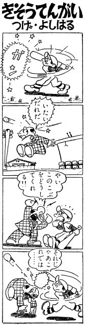 Tsuge’s first published manga was in October 1954. Hanin wa Dare Da!! (Who did it?) and Kiso Tengai appeared in the pages of Tsukai Book, a children’s magazine published by Hobunsha. These were short one- and four-panel gag scripts he used to make his portfolio. Much to his mother’s dismay, Tsuge quit his job at the electroplating factory and began shopping his work to publishers. He spent about a week before he was accepted by his tenth publisher. Tsuge made his official professional debut in May 1955 with the highly Tezuka-influenced Hakumen Yasha (White-faced Yasha), a fairy tale story of a young boy who takes the name Hakumen Yasha to fight against the corrupt local lord.
