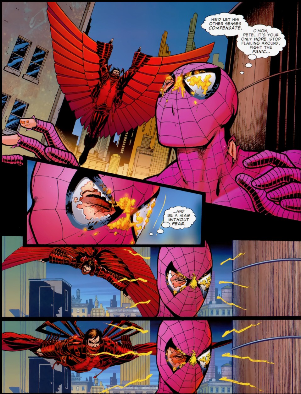 Yes, there’s a new Vulture in town. And he eats people. And his wings are actual wings, not a battle suit. He also spits venom, which blinds our hero and forces him to take a page from Daredevil’s playbook and use his other senses, including his spider sense.