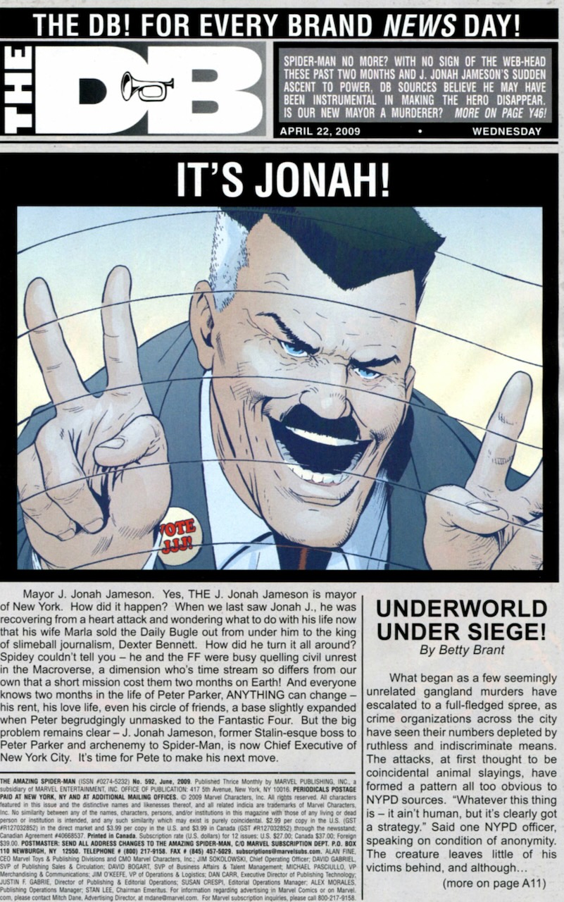 In addition to a few pages of exposition inside the book proper, the “summary” DB! splash page instead catches us all up on what’s happened over the last 60 days. As readers, we don’t get to see this. Doesn’t this undermine the whole “Brand New Day” strategy of making Spider-Man’s universe easier to follow? Surely the other creative teams could have covered these two months and given readers a look at what happened while Spidey was away?