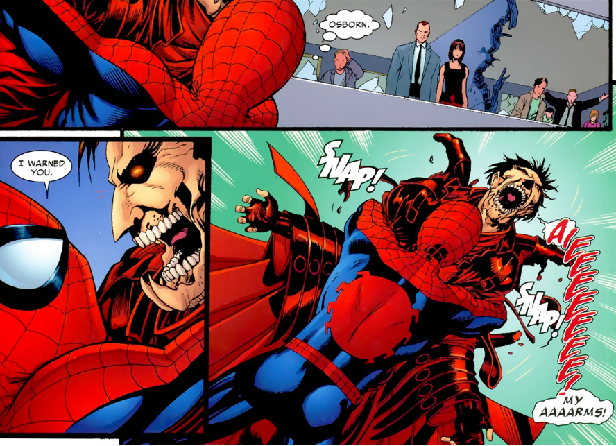 In their rematch, Spidey does something we don’t see him do very often: He intentionally breaks the Vulture’s arms.