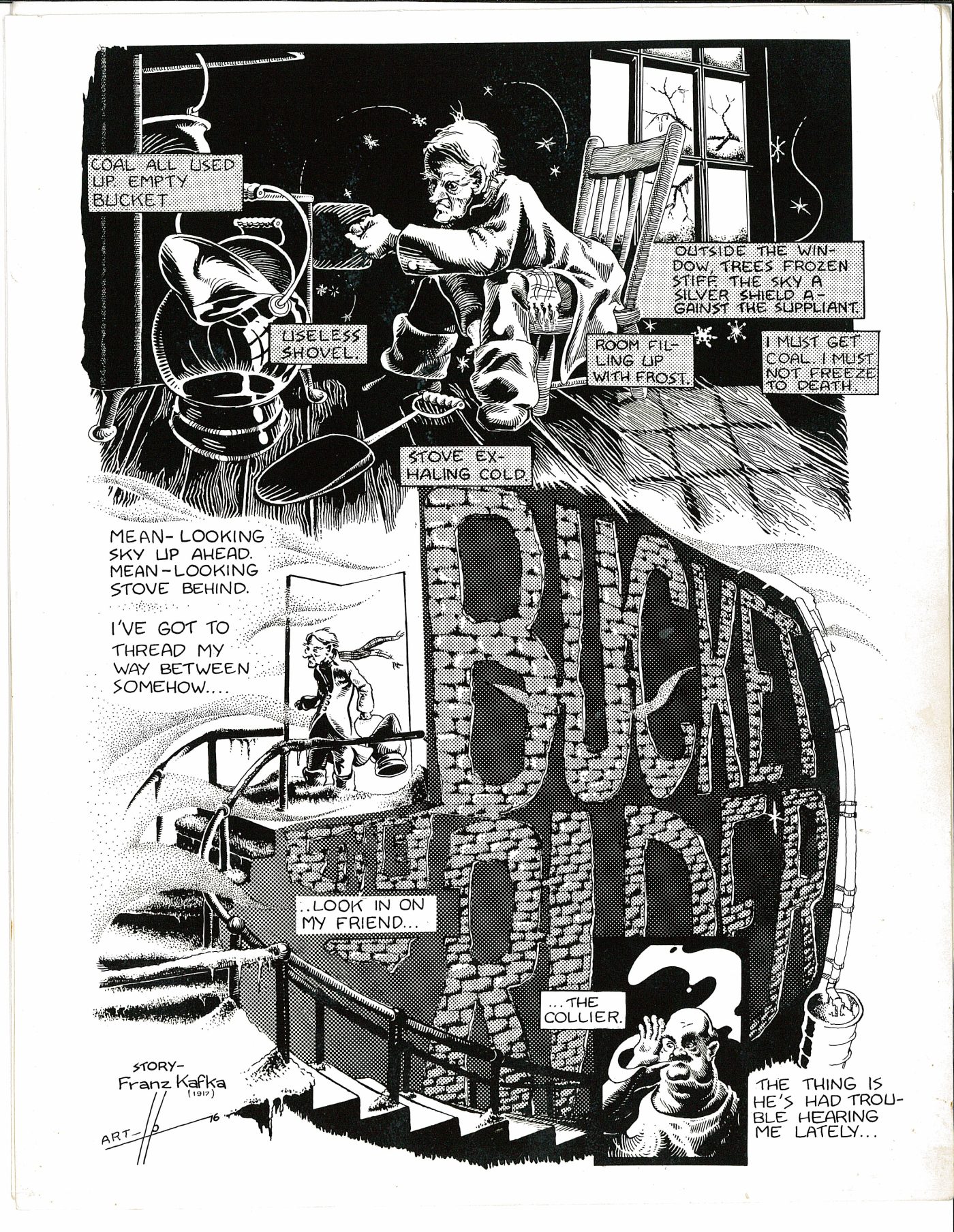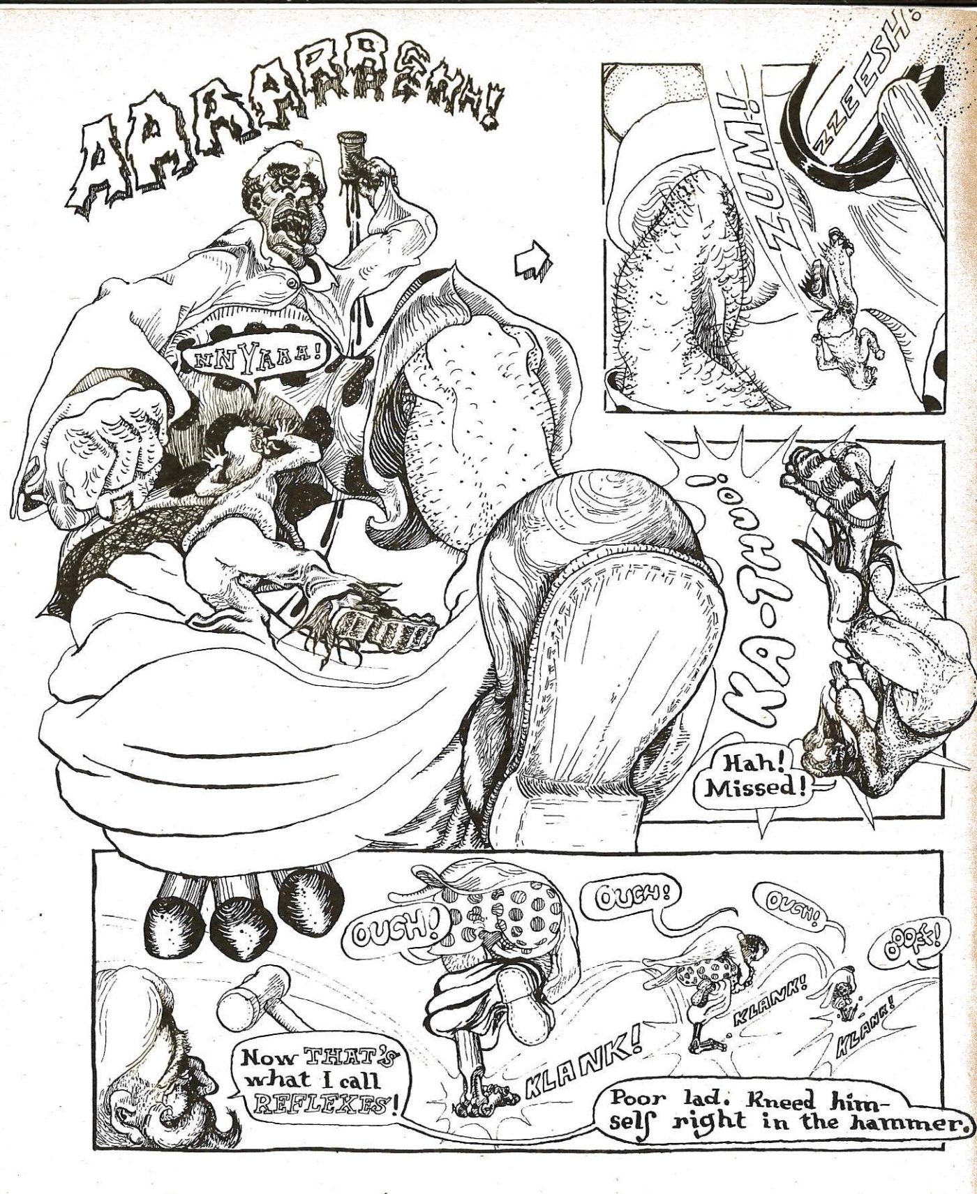 Gearfoot was Nixon. I’m not sure what that was about. When I started it I had no idea how it would end. I had this image of the American president as an artifice, a thing that is standing up on mechanical legs, on false pretenses. At that time there were already cracks in the shell. Nixon resigned in '74. I was a little early with it. However, as far as doing the comic was concerned, I did one page then what am I going to do for the next, and then I did something else. That was how I started out doing comics. Later on, it got so you’d need a script. You’d need to plot what was going to be on each page.