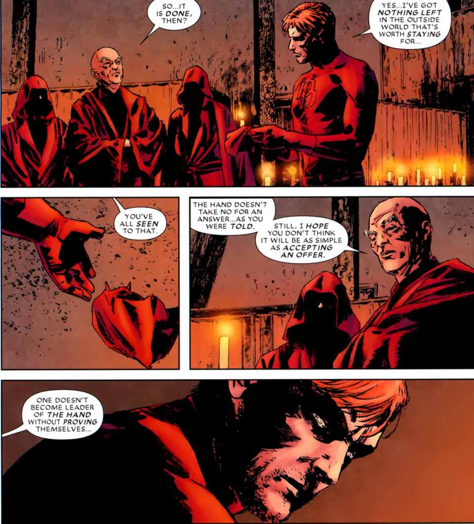 Thus, Daredevil has not only been brought back into the world of Kingpin–he’s now going to become leader of The Hand, from whom Kingpin hired Elektra so long ago.