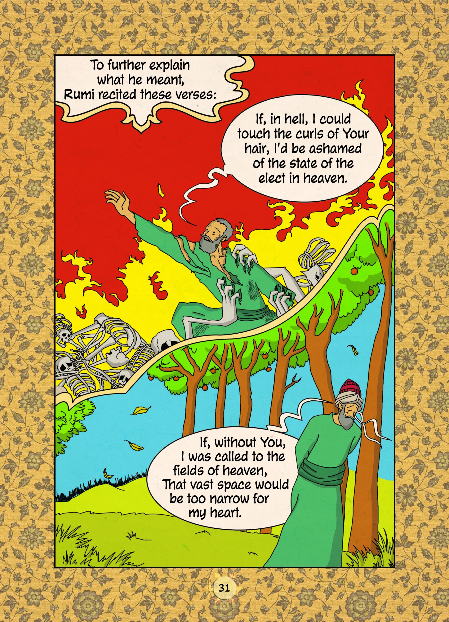 Page from Rumi Vol. 2, Compiled & Edited by Mohammed Ali Vakil, storyboard & art by Rahil Mohsin, color by Mahdi Tabatabaie Yazdi, production byAbdul Gafur Madinal and calligraphy by Muqtar Ahmed.