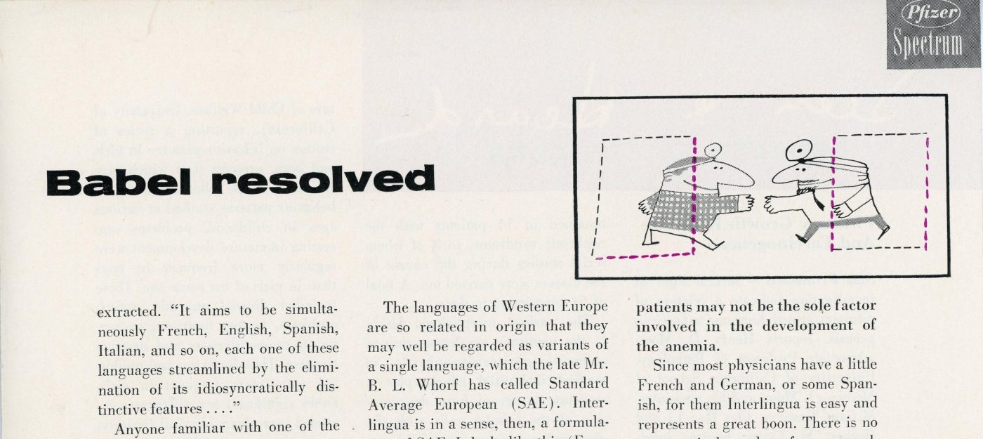 Around this same time, he designed an ad for NBC television, which he also cartooned. And then he created a four-panel comic strip for the Journal of American Medical Association, “Clinical Trials”, that he wrote as well as drew, in addition to article openers. Even when not directly employing cartooning, his designs often contained a cartoonist’s light-hearted touch, both on his book and magazine covers.