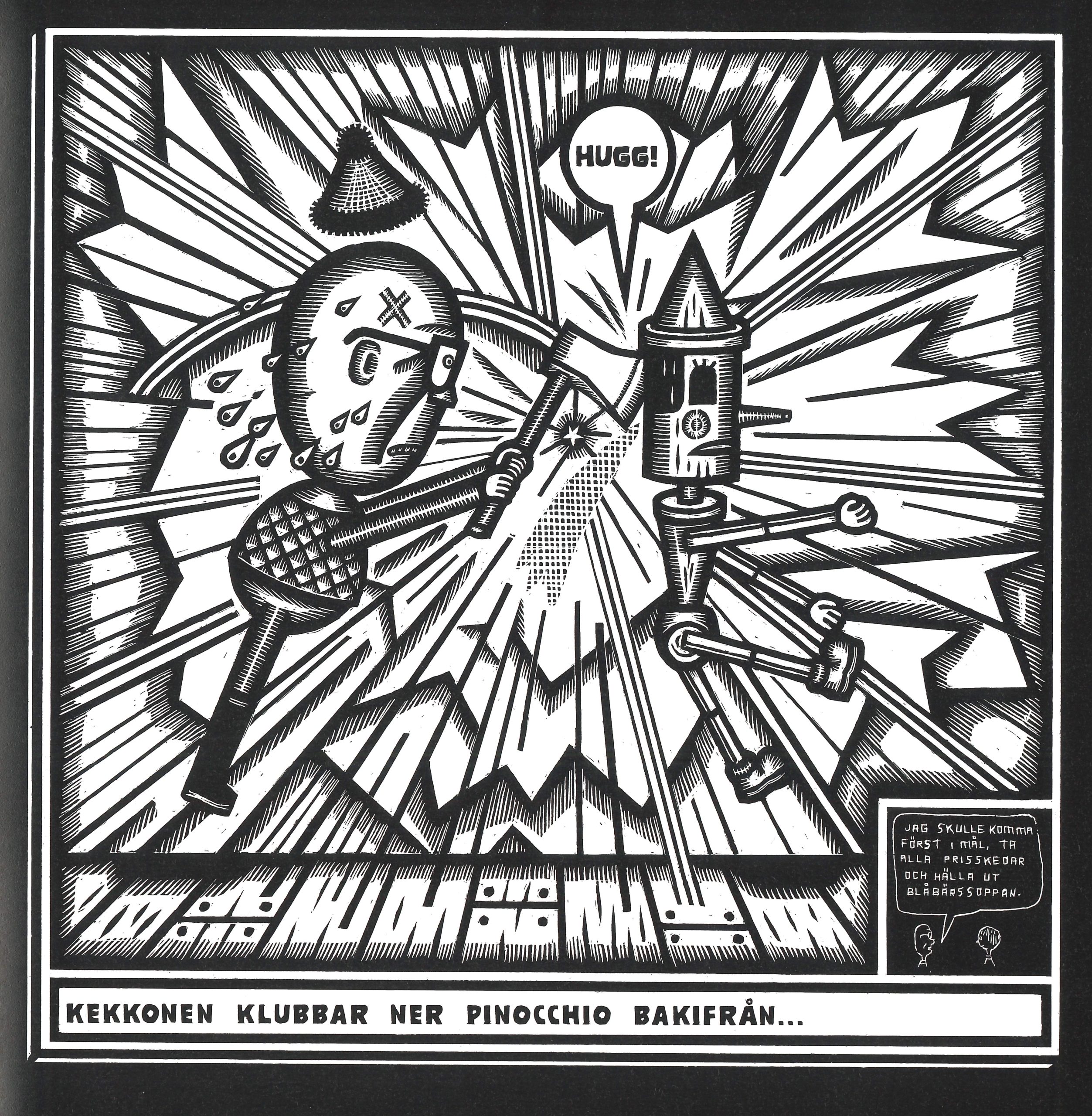 Page from Kekkonen, in which Kekkonen kills Pinocchio.So that was the motivation behind the book about Kekkonen, where you transform Finland’s most influential politician of the postwar period — also known for his drinking and extramarital affairs — into a fantastical narrative?