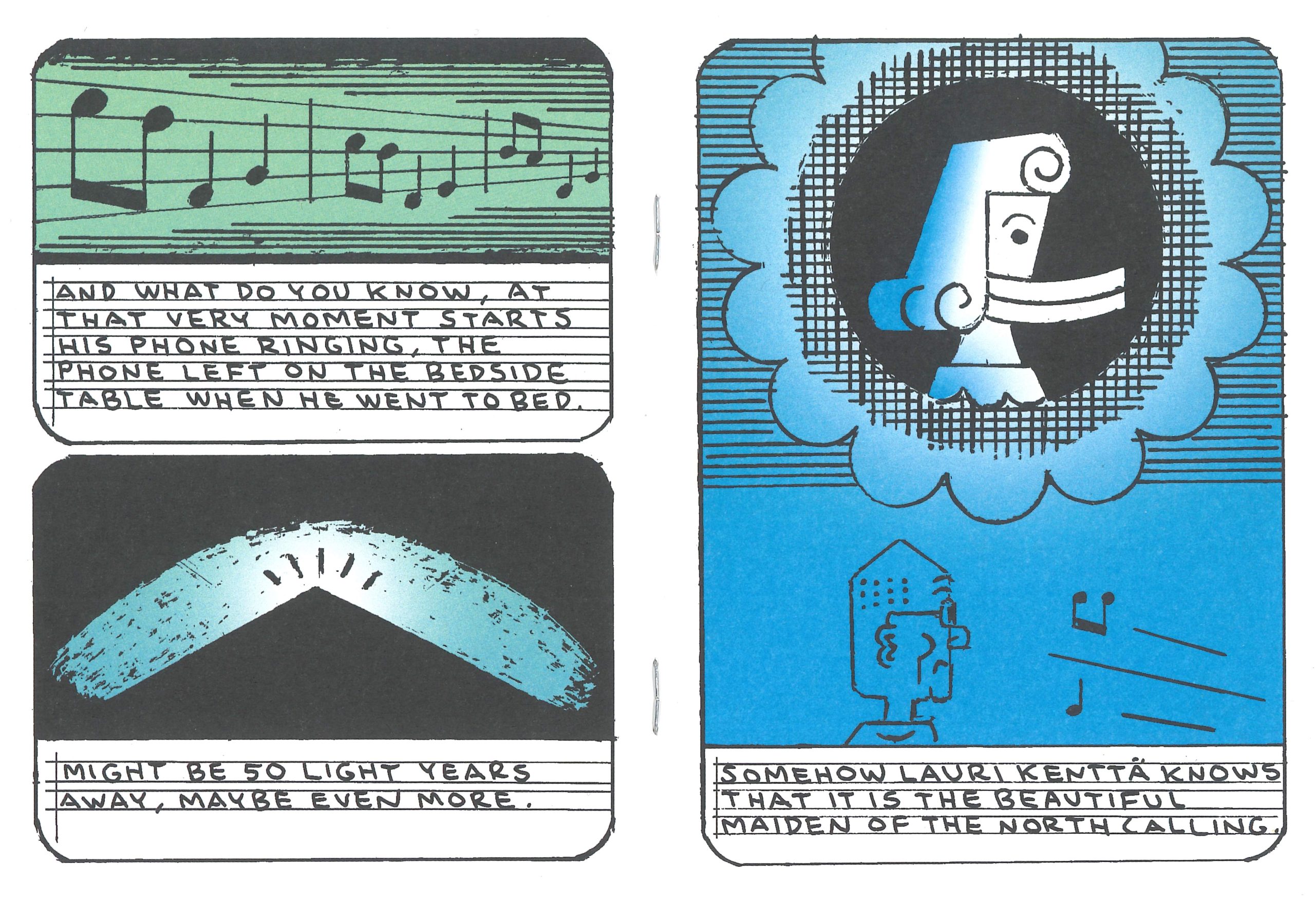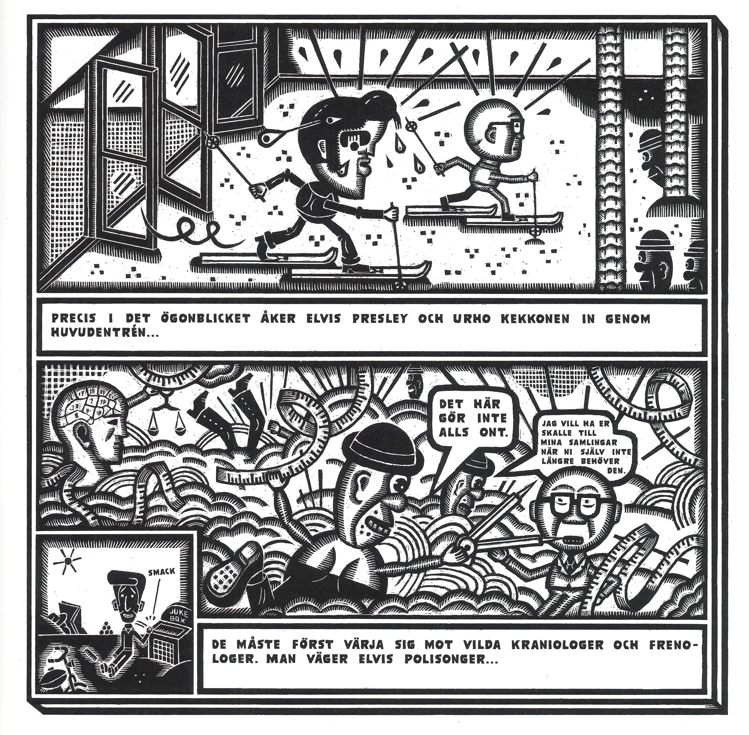 Not infrequently, Hagelberg juxtaposes philosophical or theological speculation with a liberatingly childlike logic, and his absurdist comic twists are consistently entertaining. He also plays a major role within his own comics, appearing in various incarnations and alter egos such as Mr. Matti Hagelberg, Matti Hagelberg, and the superhero Lauri Kenttä (the name “Kenttä” dates back to the 1950s, when Clark “Superman” Kent was given a Finnish-sounding surname in translation). Hagelberg’s absurd humor is particularly evident in his 2004 graphic novel Kekkonen, in which he reimagines former president Urho Kekkonen — the most dominant Finnish politician of the postwar period, who served for 26 years — as a fantastical storybook character rubbing shoulders with Elvis, Jesus, and extraterrestrials. This was followed in 2010 by Silvia Regina, a biting and darkly humorous portrayal of Finland as a nation driven by greed.