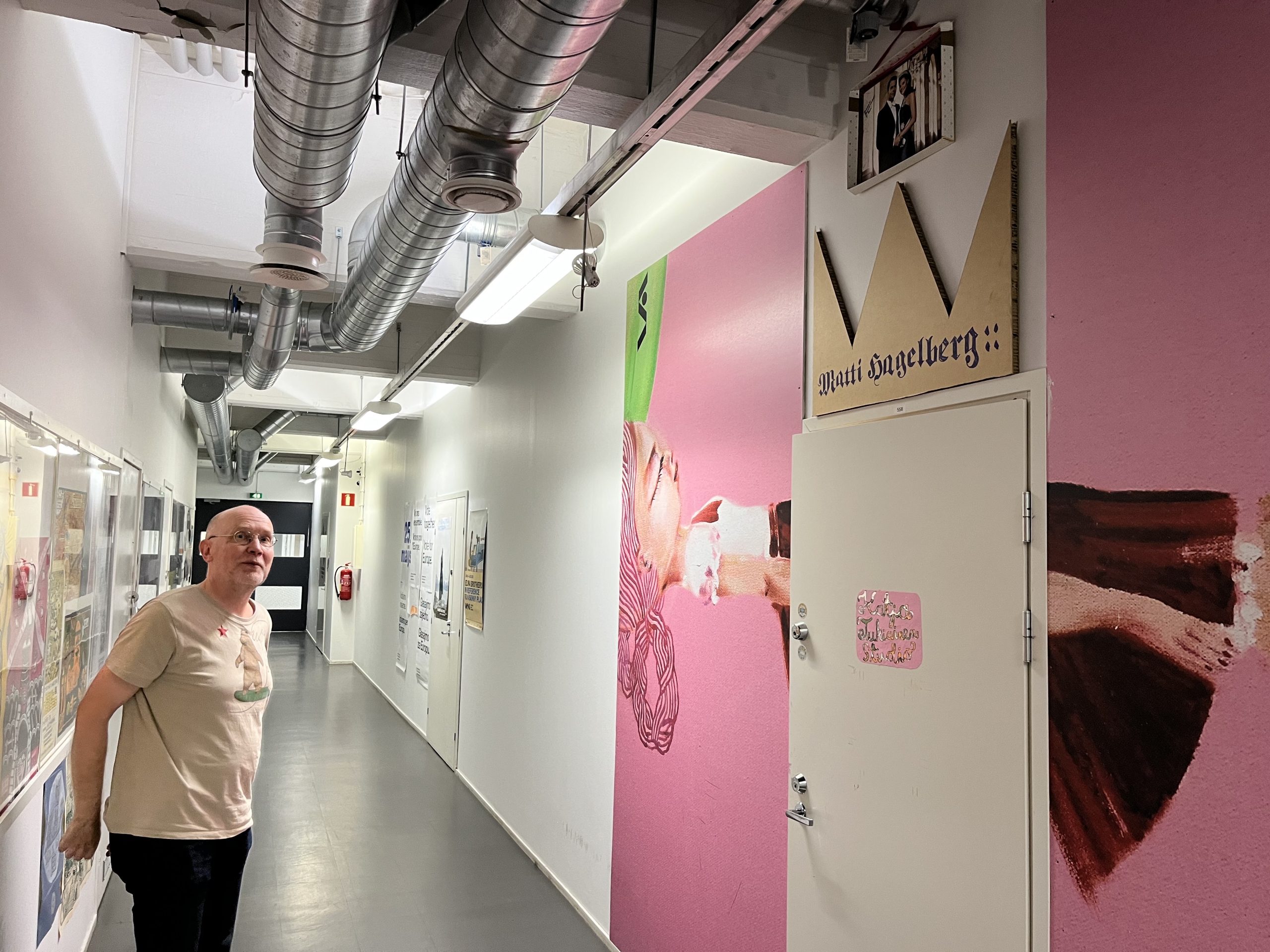 The entrance to Matti Hagelberg and Katja Tukiainen’s studio.Hagelberg’s studio is located on the fifth floor of the Cable Factory, a rugged former industrial complex in Helsinki’s Ruoholahti district in the southwestern part of the city. Once Finland’s largest building and a production site for marine cables, the Cable Factory now serves as one of the country’s most important cultural centers. Finding Hagelberg’s studio, however, is not difficult because of the building’s size, but because the long list of artists’ names posted at the entrance includes neither “Matti Hagelberg” nor any of his many aliases — whether “Herr Matti Hagelberg,” “Doctor Matti Hagelberg,” “Lauri Kenttä,” “mti hglbrg,” or others familiar from his spoof-autobiographical comics. Instead, visitors should follow the sign pointing toward “Katja and Matti’s Detective Agency,” where “Katja” refers to his wife, the artist Katja Tukiainen, with whom he shares the studio. The atelier itself is a large open space filled with paintings, books, and the smell of paint. Hagelberg’s desk is positioned at the center of the room, where the interview takes place. He speaks slowly and thoughtfully, in a slightly raspy voice that can suddenly increase in both tempo and warmth when he becomes engaged.